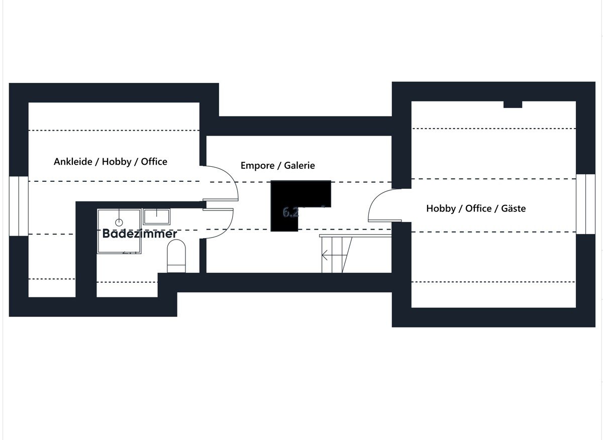 - Empore / Spitzboden: Ankleidezimmer, weiterer Raum für Hobby / Office / Gäste