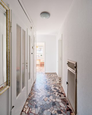 Die verschiedenen Bodenbeläge, die in der Immobilie vorhanden sind, umfassen Fliesen, Linoleum, Parkett, Teppichboden und Stein. Jeder Raum ist individuell mit einem dieser Beläge ausgestattet, was eine gewisse Vielfalt in der Gestaltung der Räume schafft.