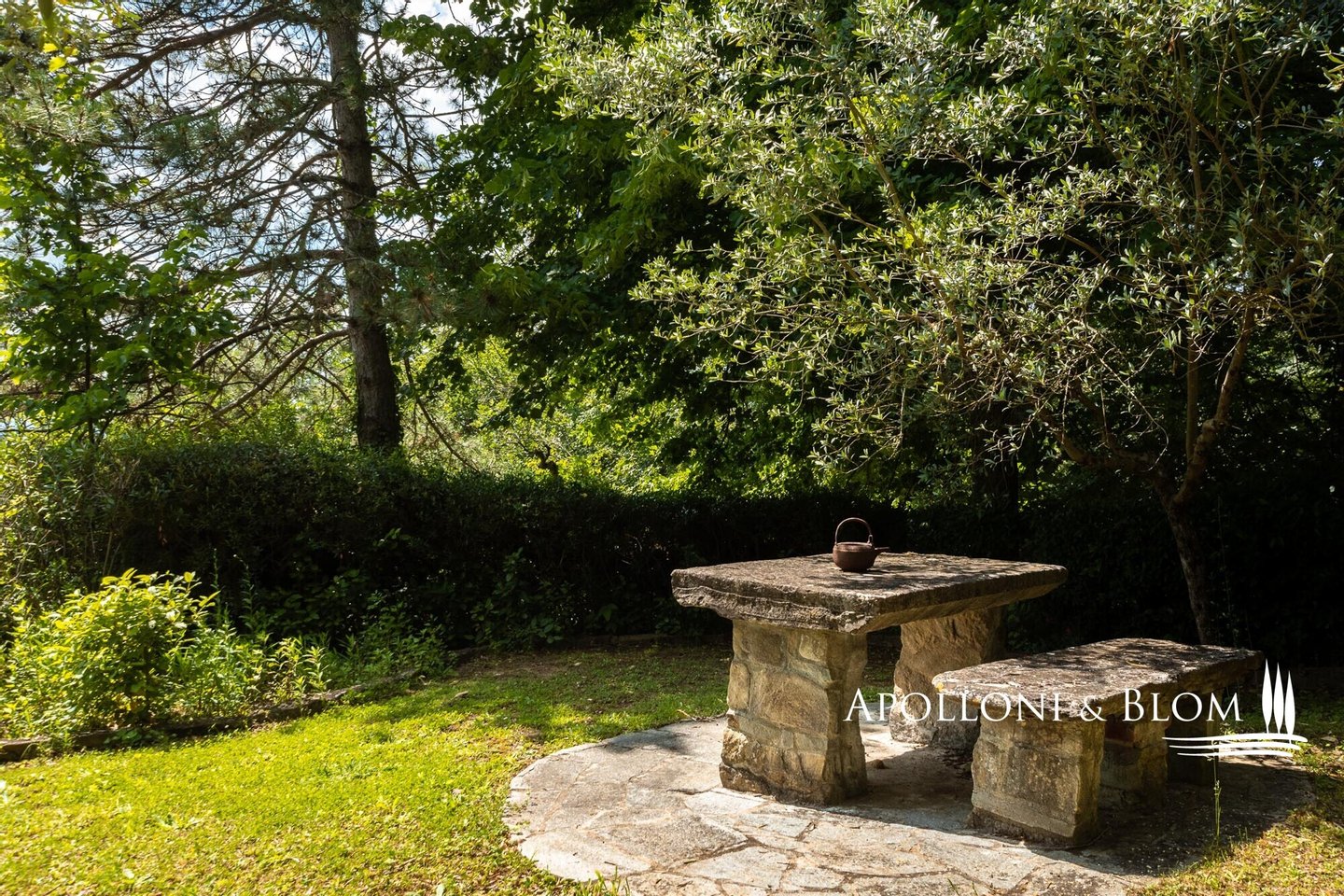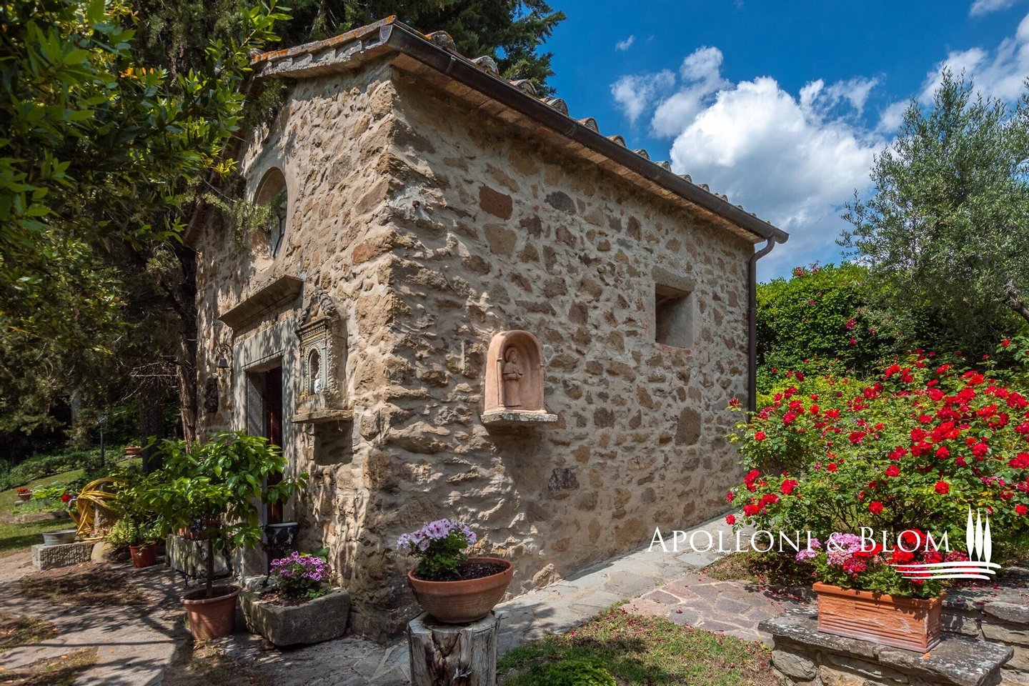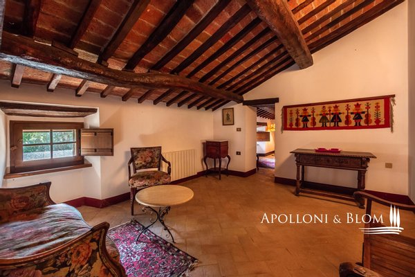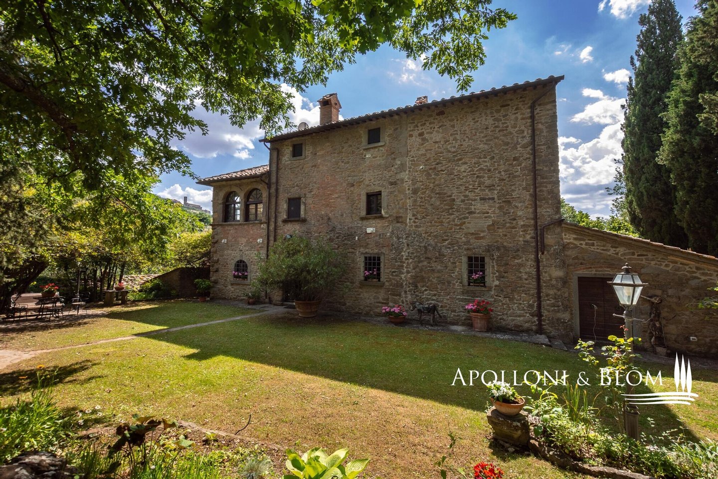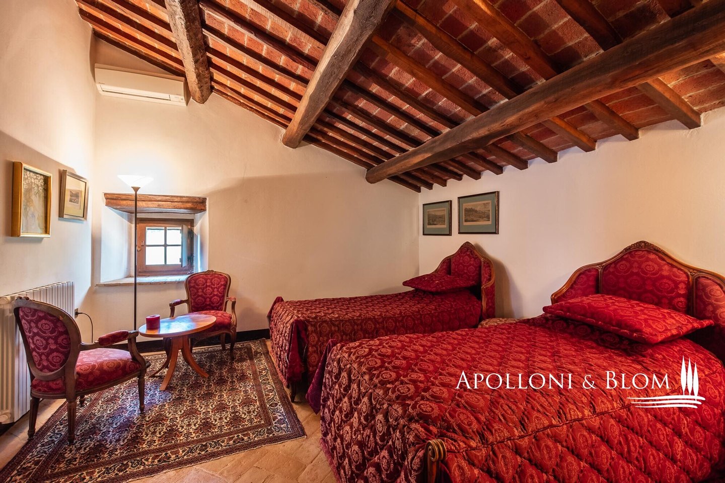 Bezaubernde Lage, fein restauriert mit Gästeanbau, privater Kapelle, Garage, Lagerraum, Olivenhain und Weinberg in Cortona zu verkaufen. Nur wenige Minuten vom historischen Zentrum entfernt, stellt diese prestigeträchtige Landvilla aus Stein eine einmalige Gelegenheit für diejenigen dar, die ein elegantes Anwesen in der Toskana suchen, das authentischen Charme und Potenzial sowohl als privater Wohnsitz als auch als wertvolle Investition bietet. Das Anwesen besteht aus dem Hauptwohnsitz, der gekonnt restauriert wurde und sich auf drei Ebenen über ca. 478 m² erstreckt, einer reizvollen, 20 m² großen Privatkapelle, einem großzügigen 160 m² großen Nebengebäude mit Gäste- und Abstellräumen, einer Garage mit drei Stellplätzen, weiteren landwirtschaftlichen Nebengebäuden und einem charmanten Pavillon mit Holzofen und gemütlichem Bereich mit Blick auf das Tal. Die Villa wurde einer sorgfältigen Restaurierung unterzogen, bei der die traditionelle Architektur aufgewertet und mit modernen Annehmlichkeiten kombiniert wurde. Die hellen und eleganten Innenräume sind mit Details aus der Zeit bereichert. Im Erdgeschoss befinden sich der Haupteingang, verschiedene Empfangsräume, darunter ein Wohnzimmer, ein Esszimmer, eine Küche mit Kamin, ein weiteres Wohnzimmer, ein Verkostungsraum und ein Badezimmer. Das erste Stockwerk öffnet sich zu einer Veranda mit einem Wohnzimmer, einem Schlafzimmer und einem Badezimmer, während das zweite Stockwerk einen Flur, drei Schlafzimmer und ein Badezimmer beherbergt, die alle einen beeindruckenden Blick auf die umliegende Landschaft bieten. Das Anwesen umfasst etwa 8 Hektar Land mit einem gepflegten Garten, einem Olivenhain mit 1.100 Bäumen, einem Obstgarten, Ackerland und einem kleinen Weinberg von etwa einem halben Hektar, mit der Möglichkeit der Erweiterung. Ein Teich mit einheimischer Fauna und der Panoramapavillon tragen zu einer authentischen und raffinierten Atmosphäre bei. Ausgestattet mit Klimaanlage in allen Räumen, Heizung, Alarmanlage und gepflegten Außenanlagen eignet sich dieses Anwesen sowohl als repräsentativer Privathaushalt als auch als Investition mit hervorragendem Potenzial im Gastgewerbe. Verkehrsgünstig gelegen, nur 1 km von den wichtigsten Dienstleistungen entfernt.