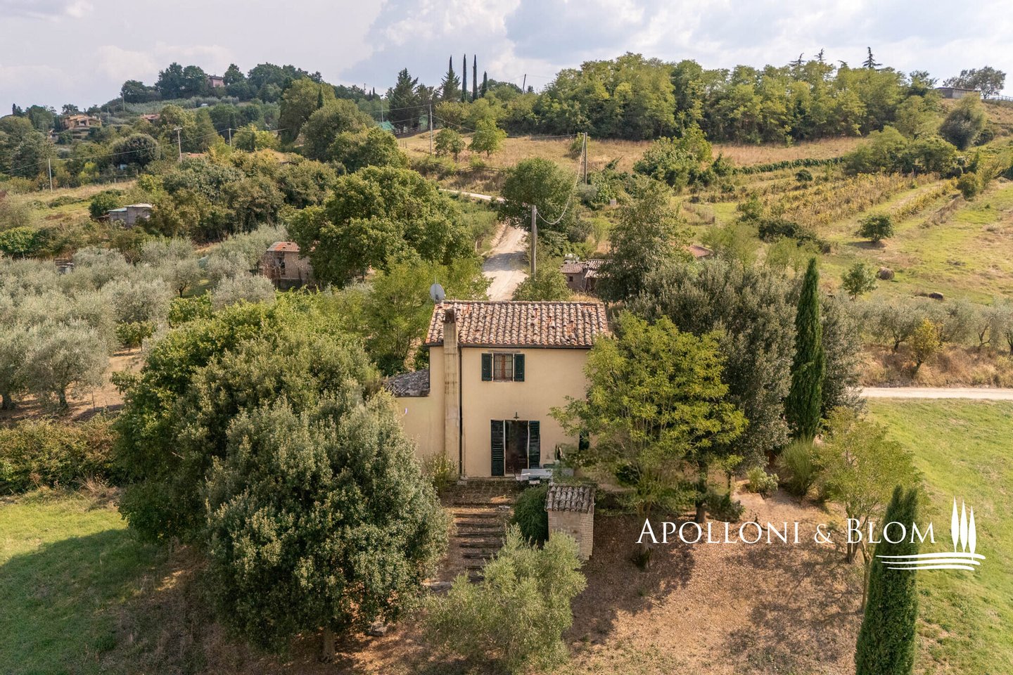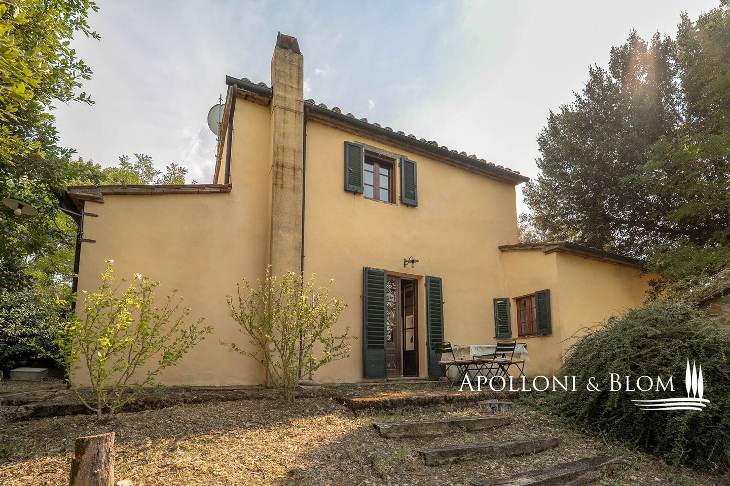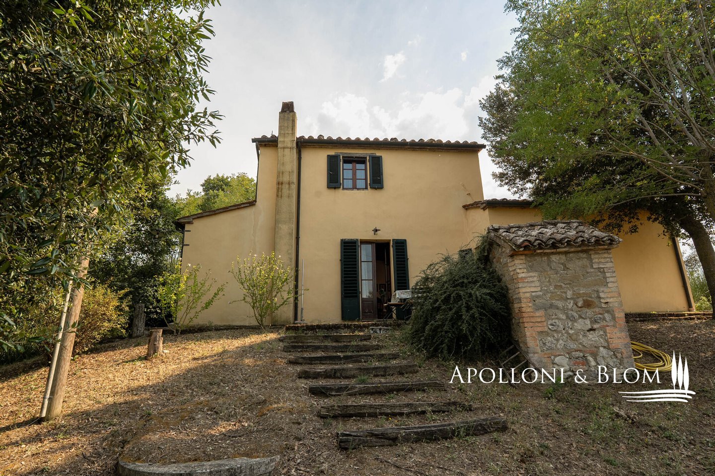 Typ: Villa auf zwei Ebenen von 148 Quadratmetern mit typischer Außentreppe und Säulengang, Garten und 2,6 Hektar landwirtschaftlicher Nutzfläche