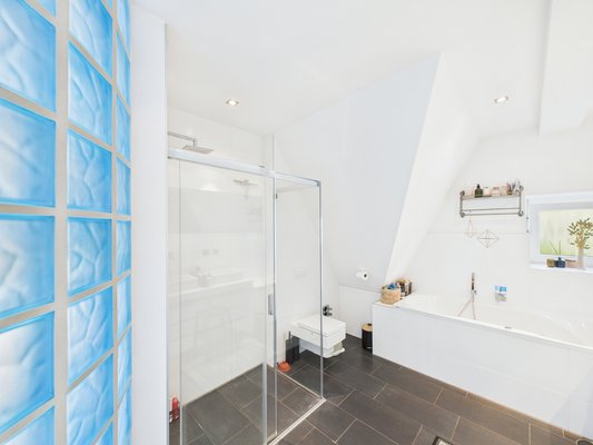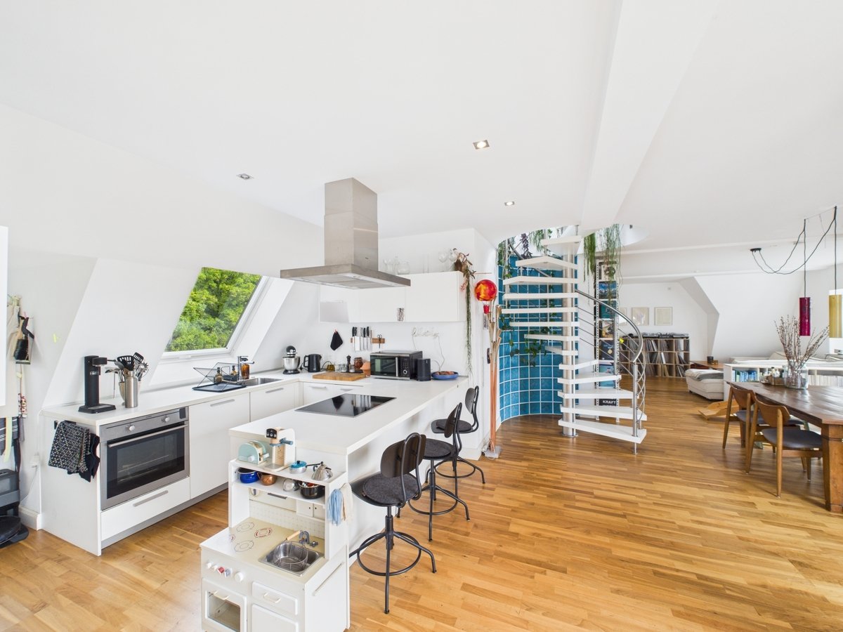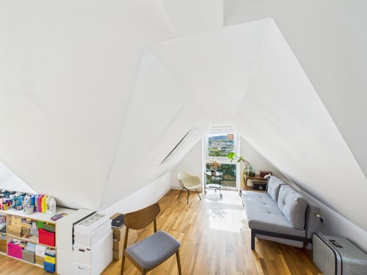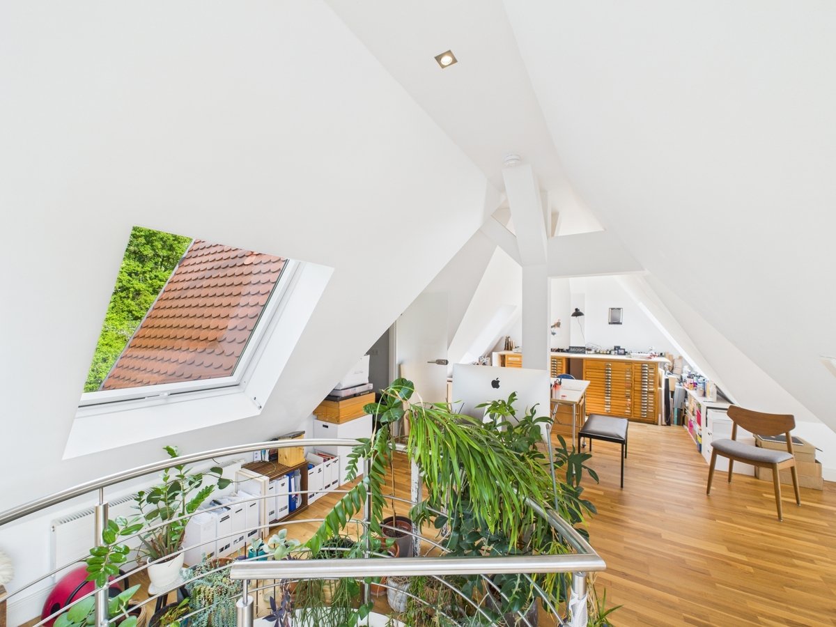 Über die Wendeltreppe gelangt man auf die obere Ebene der Maisonette-Wohnung und befindet sich direkt in einer hellen Loggia, die eine Traumaussicht auf die Stadt bietet. Hier finden Sie auch ein weiteres Zimmer, das als Schlafzimmer oder Atelier genutzt werden kann. Ein weiteres Badezimmer mit WC und Dusche sorgt für zusätzlichen Komfort.