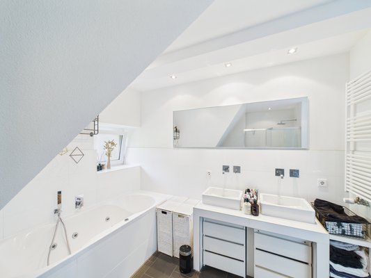 Ein Highlight der Wohnung ist der großzügig gestaltete Wohnbereich, welcher wie die gesamte Wohnung äußerst lichtdurchflutet ist. Ebenfalls auf dieser Etage befindet sich das sehr große Elternschlafzimmer, in dem ein gemütlicher Arbeitsbereich mit Blick in den Garten anschließt. Neben dem Schlafzimmer ist auch das große Badezimmer, welches mit einer bodentiefe Dusche, Badewanne und 2 Einzelwaschbecken ausgestattet ist.