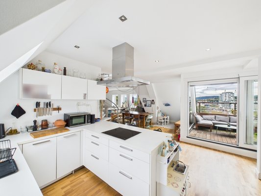 Beim Betreten der Wohnung über das Treppenhaus erwartet Sie ein sehr großzügiger Wohnbereich, der nahtlos in eine offene Küche übergeht. Die Küche ist modern ausgestattet und bietet viel Platz für kulinarische Kreationen. Neben der Küche befindet sich zudem das Gäste-WC.