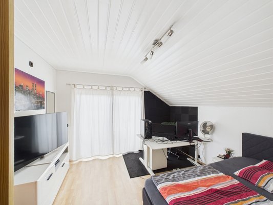 Das Obergeschoss verfügt über insgesamt 4 große Zimmer. Im Hauptschlafzimmer befindet sich zudem ein Zugang zu einem weiteren Zimmer, welches aktuell als Home Office Platz hergerichtet ist. Ein Balkon in Ostausrichtung schließt hier ebenfalls an und ist sowohl vom Schlafzimmer als auch vom Home Office zu betreten.