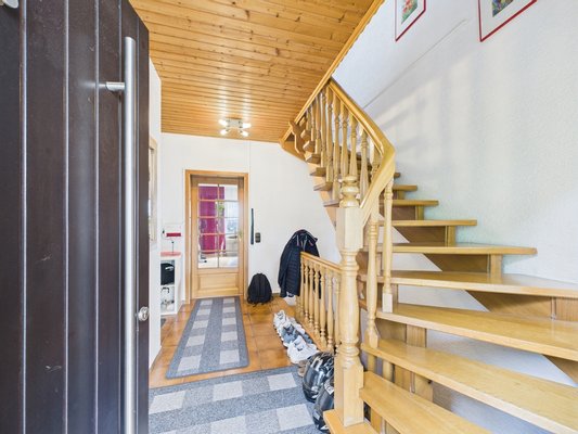 Eingangsbereich: Beim Betreten des Hauses befindet man sich in einem einladenden Flur, der Platz für Garderobe und Schuhe bietet. Über den Flur erreichen Sie alle Zimmer dieser Etage sowie über das Treppenhaus auch den Keller und den 1.Stock.