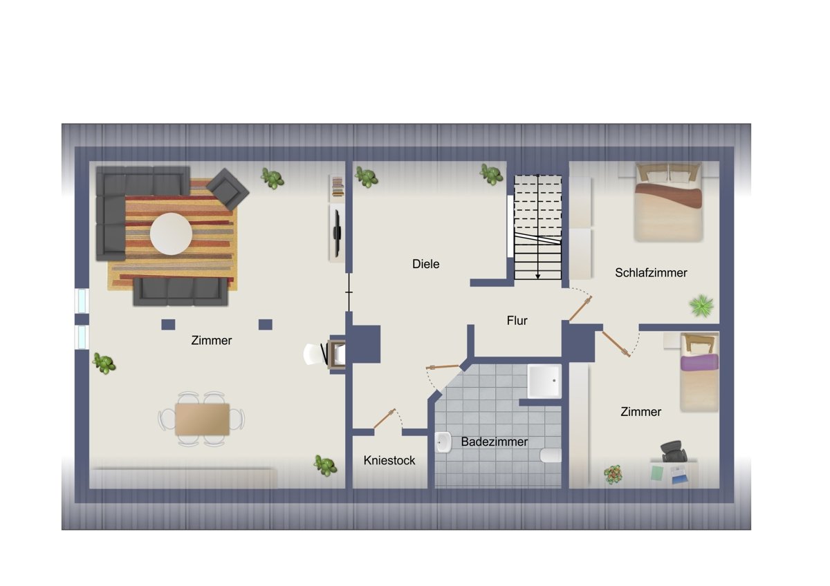 Großes Zimmer im 2. OG kann noch getrennt werden, als z. Bsp. 2 Kinderzimmer. Somit sind bis zu 7 1/2 Zimmer möglich.
