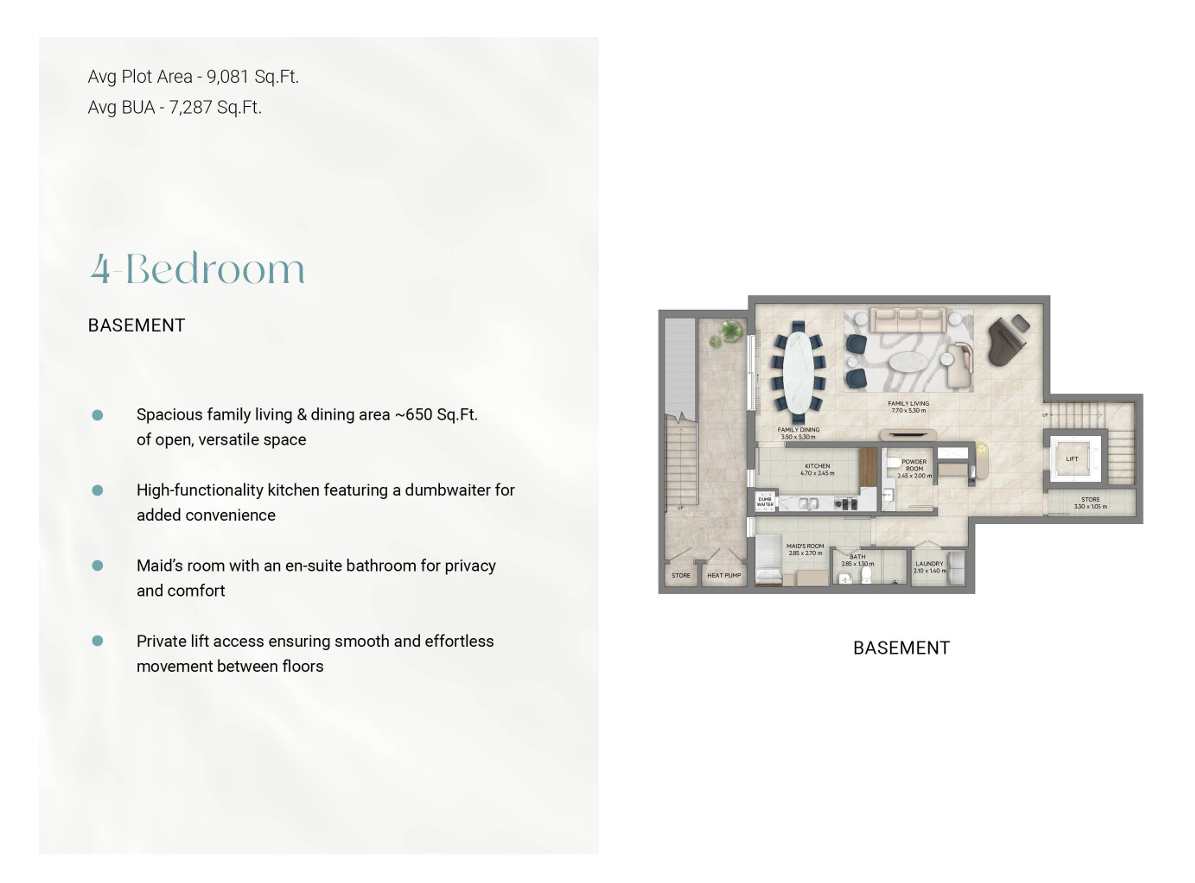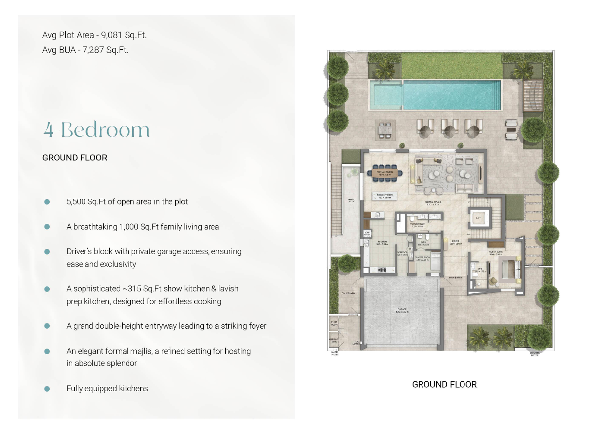 Die Luxusvilla verfügt über 4 Schlafzimmer sowie ein separates Bedienstetenzimmer mit eigenem Badezimmer und einen Fahrerzimmer mit Badezimmer. Die voll ausgestattete Küche lädt zum Kochen ein, während das majlis einen idealen Ort für geselliges Beisammensein bietet. Ein privater Aufzug ermöglicht einen bequemen Zugang zu den verschiedenen Etagen des Hauses.