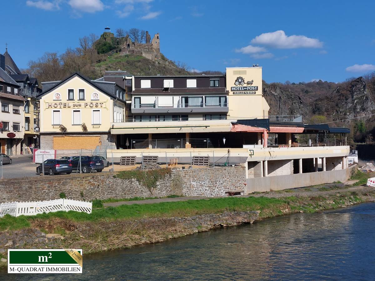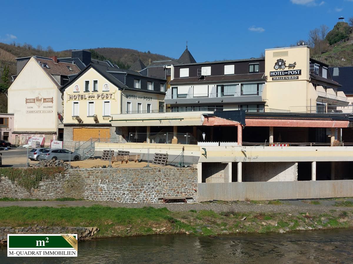 Das Hotel "Zur Post" liegt direkt an der Ahr und wurde durch die Flut-Katastrophe 2021 mit einer meterhohen Flutwelle bis zur Dachterrasse überflutet und zum Teil zerstört.