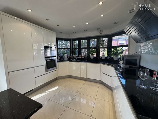 Beim Betreten werden Sie von der großzügigen Diele empfangen, die den Weg zu den verschiedenen Räumen im Erdgeschoss zeigt. Rechtsseitig nach der Diele befindet sich die separat gehaltene Designerküche mit Granitelementen, die speziell für dieses Haus entworfen wurde. Der angrenzende Essbereich, der über Platz für die ganze Familie verfügt, führt direkt in den Wohnbereich der mit einem gemütlichen Kamin und einer großen Fensterfront zum Garten besticht.