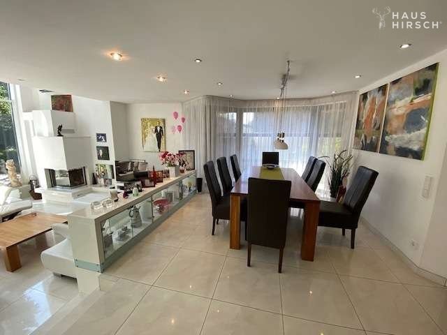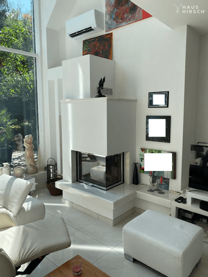 Das Erdgeschoss ist mit hellen Fliesen versehen. Die Highlights hier sind der Kamin und die große Fensterfront.