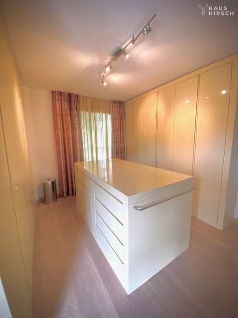 Über eine elegante Holztreppe, die mit Glaswänden abgeschlossen wird, gelangen Sie in das erste Obergeschoss, wo Sie auf einer Empore als Diele den Blick auf das Wohnzimmer und die große Fensterfront genießen können. Hier befinden sich zwei Schlafzimmer, ein Ankleidezimmer, welches ebenfalls als Schlafzimmer genutzt werden kann und zwei luxuriös ausgestattete Badezimmerer.