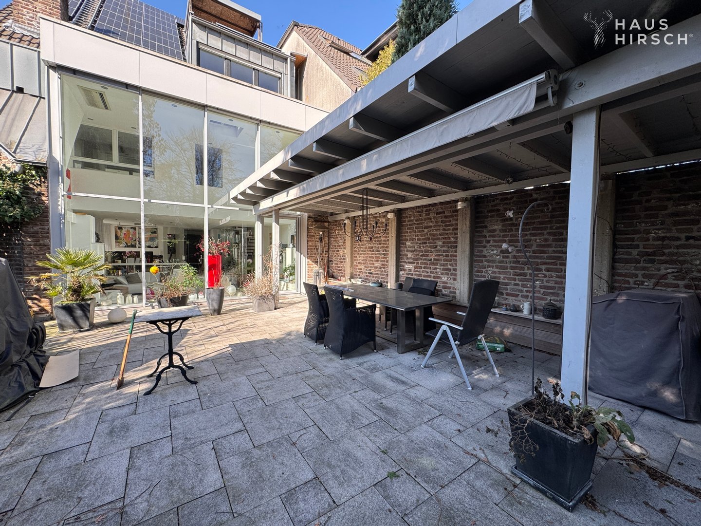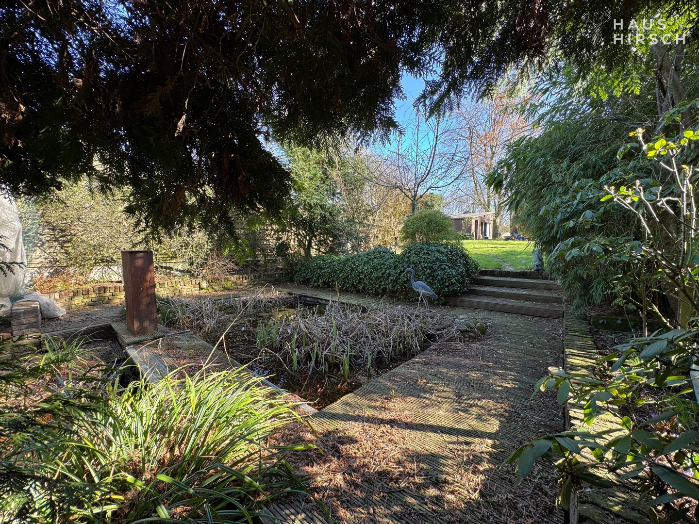 Die Terrasse lädt zum Verweilen ein und führt direkt in den uneinsichtigen Garten mit altem Baumbestand und einem idyllischen Teich.