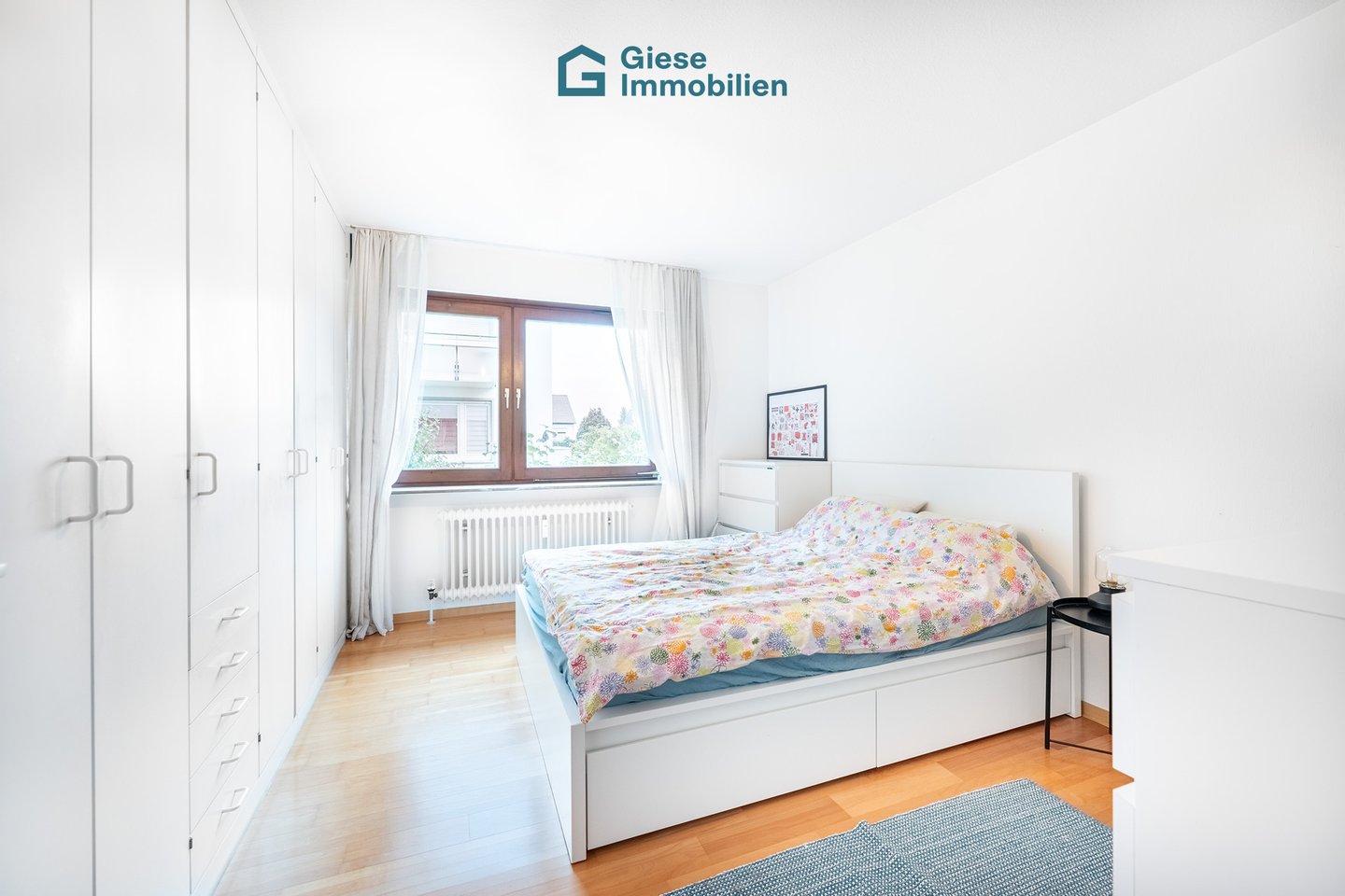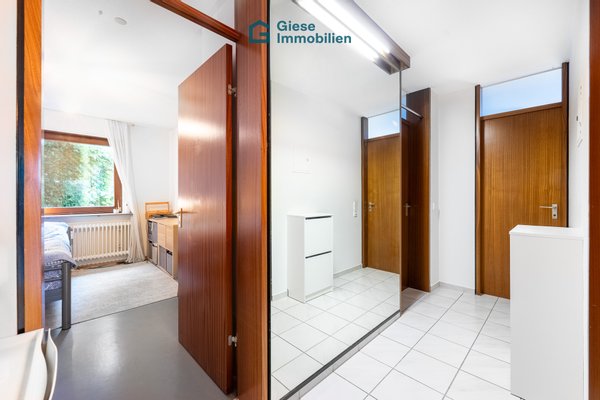 Zurück über den Flur mit dem großen Spiegel erreicht man das Schlafzimmer mit einen großen Einbauschrank, das durch seine ruhige Lage einen geschützten Bereich zum Zurückziehen bildet. Das zweite Zimmer zwei weiteren Einbauschränkenlässt sich flexibel nutzen – beispielsweise als Kinderzimmer, Homeoffice oder Gästezimmer – ganz nach den persönlichen Bedürfnissen.