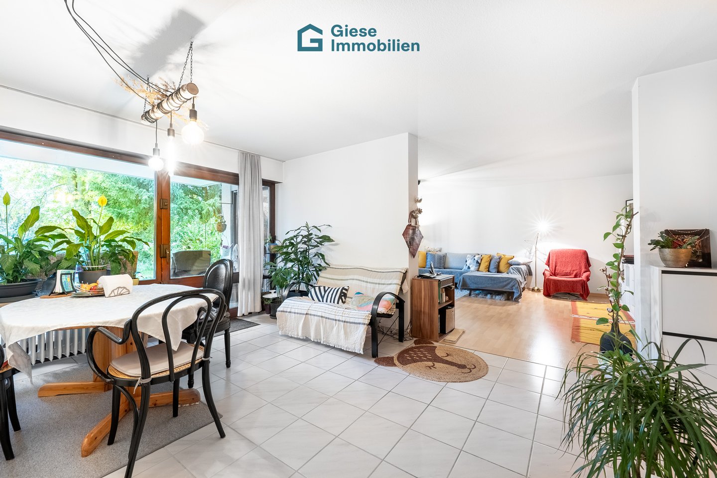 Von hier aus eröffnet sich der direkte Zugang zur überdachten Südterrasse und dem außergewöhnlich großen Gartenanteil, welcher der Wohnung ein unvergleichliches Wohngefühl verleiht – ideal für lange Sommerabende im Freien, gesellige Runden oder einfach einen privaten Rückzugsort mitten im Grünen.