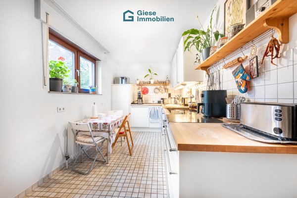 Angrenzend befindet sich die Einbauküche mit Elektrogeräten, die separat gehalten ist und damit vom Wohn- und Essbereich klar abgegrenzt bleibt. Dadurch entstehen ruhige Arbeitsbereiche und eine saubere Trennung zwischen Kochen und Wohnen.
