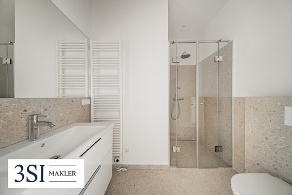 - Badezimmer mit WC, Dusche, Waschbecken und Handtuchheizkörper