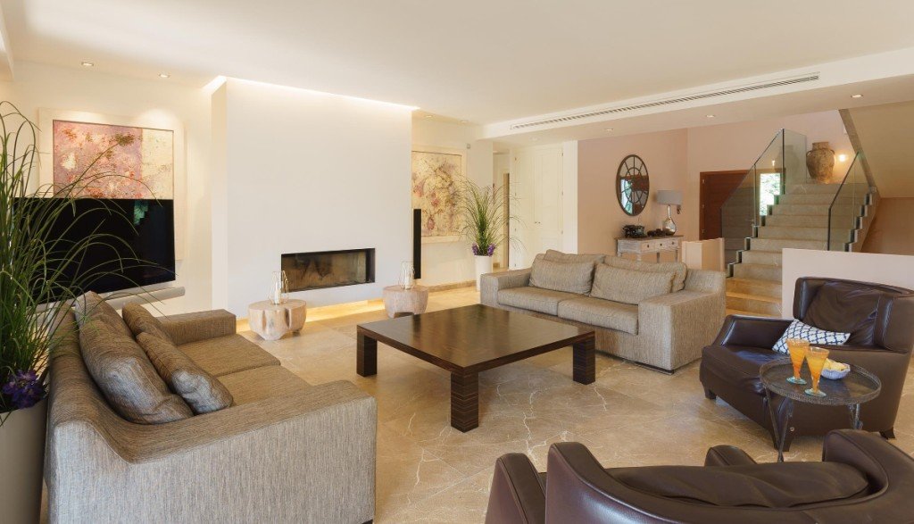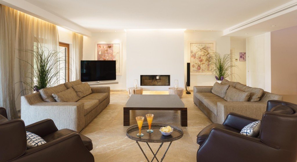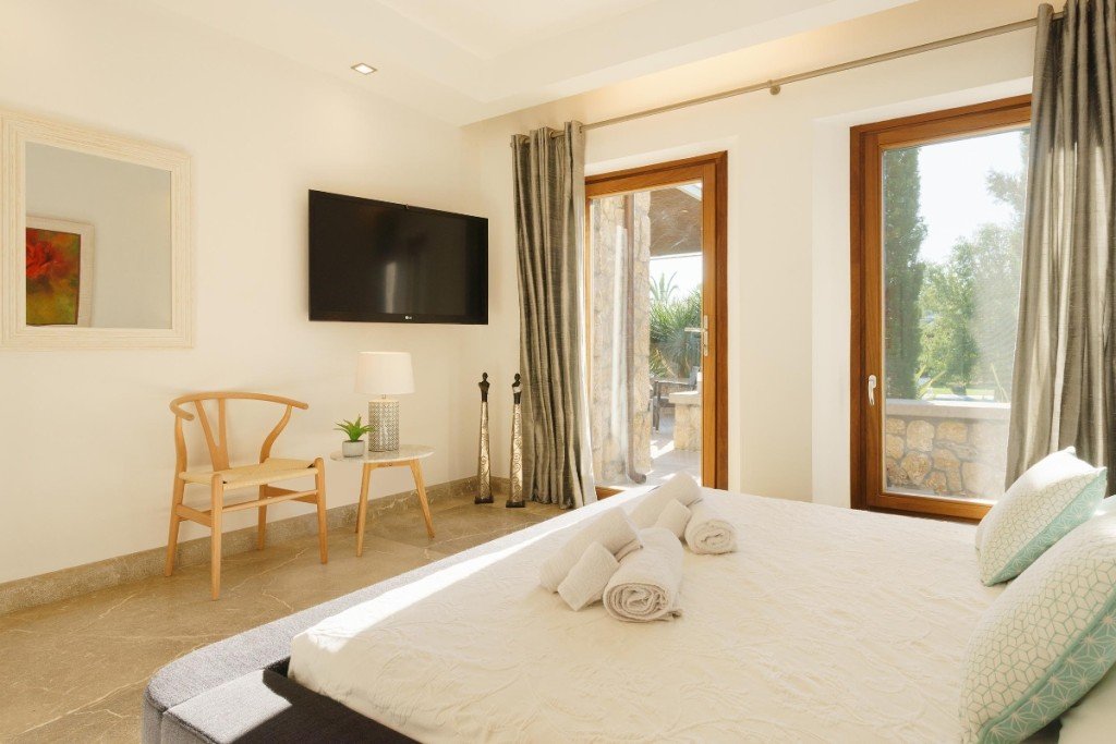 Innen haben alle Räume großzügige Dimensionen und versprühen den vollen Reiz des zeitgenössischen mediterranen Flairs. Das Anwesen zeigt mallorquinische Architektur von der feinsten Seite. Das schöne Wohnzimmer mit Kamin, eine hochmoderne Küche, 4 Schlafzimmer und 4 Bäder ( 3 en-Suite ) bilden die Haupträume, dazu gibt es auch eine Unterkunft für mögliches Personal auf der unteren Ebene. Hier befinden sich außerdem ein Fitnessraum, der Medienraum und eine Waschküche.