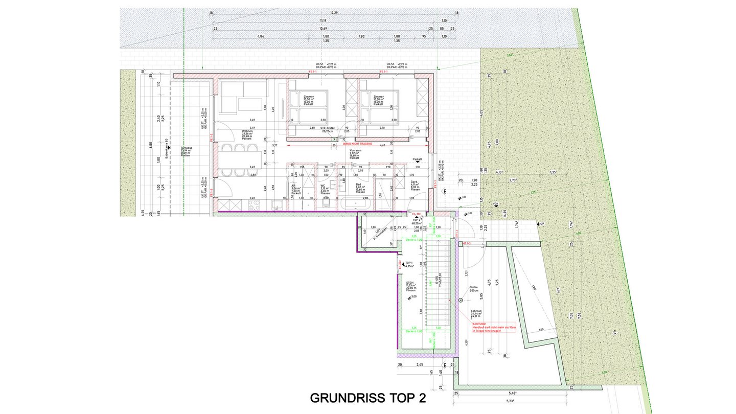 Im Erdgeschoss der exklusiven Wohnanlage befindet sich die Gartenwohnung Top 2 im Ausmaß von ca. 68 m² und teilt sich wie folgt auf: in das geräumige Entree, welches zugleich auch alle Zimmer miteinander verbindet, den großzügigen Wohn-Essbereich mit offener Küche und angrenzender Speis/Abstellraum, zwei Schlafzimmer, einem getrennten Gäste-WC sowie dem modernen Badezimmer mit großer Eckdusche und Badewanne. Die ca. 24 m² große Terrasse rundet die Wohnung perfekt ab.