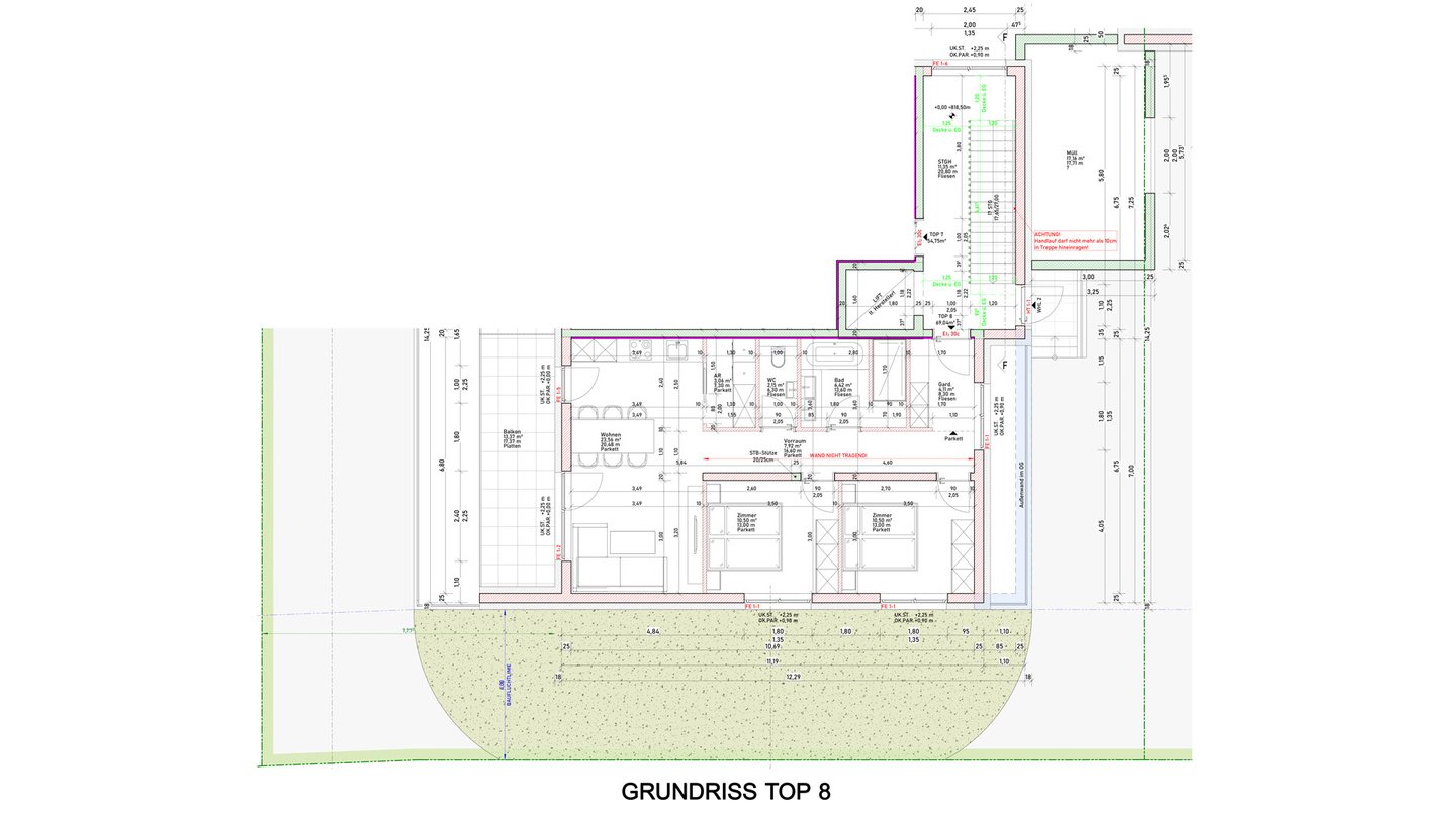 Die Wohnanlage befindet sich gerade in der Bauphase und wird voraussichtlich Mitte 2026 fertiggestellt. Die Innenräume überzeugen durch stilvolle Materialien: so wird in den Wohn- und Schlafräumen edles Eichenparkett verlegt, während Flure, Bäder und WC mit zeitlos eleganten Fliesen ausgestattet werden. Fenster und Terrassentüren sind in langlebiger Kunststoff-Aluminium-Ausführung gefertigt, die Innentüren bestehen aus hochwertigem Eichenholz. Die Küchen werden mit allen notwendigen Kalt- und Warmwasserinstallationen vorbereitet, sodass jeder Käufer die Ausstattung individuell gestalten kann. Auch die Ausstattung der Badezimmer und die Armaturen sind frei wählbar und bieten somit maximale Flexibilität bei der Gestaltung.
