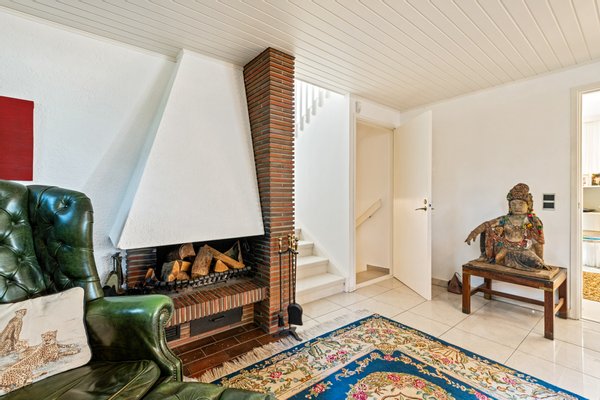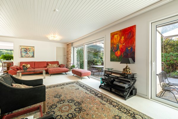 • Wohn-/Esszimmer mit bodentiefen Fenstern, (Schiebeelemente), heller Teppichboden, Zugang zur überdachten Süd-West-Hauptterrasse mit elektrischer Markise und Außenkamin