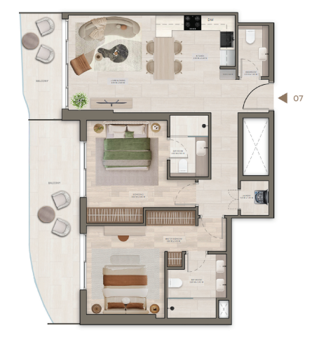 Die Wohnung verfügt über zwei gut ausgestattete Schlafzimmer, die jeweils viel Platz und natürliches Licht bieten. Das Hauptschlafzimmer verfügt über ein eigenes Bad für zusätzlichen Komfort. Das zweite Schlafzimmer ist ideal für Kinder oder Gäste.
