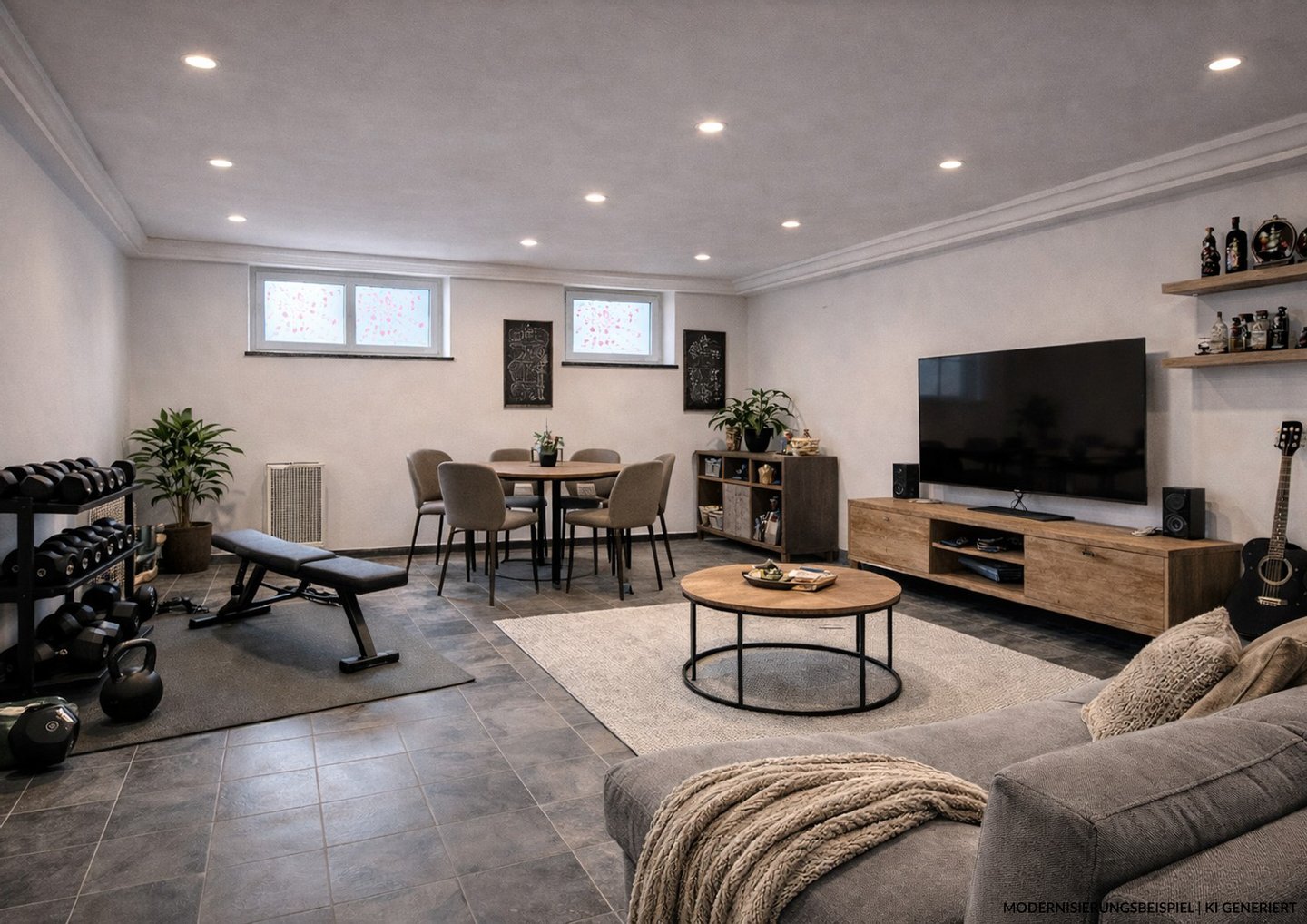 Im Untergeschoss stehen etwa 120 m² für Hobby, Gäste und Sauna mit einem weiteren Duschbad zur Verfügung.