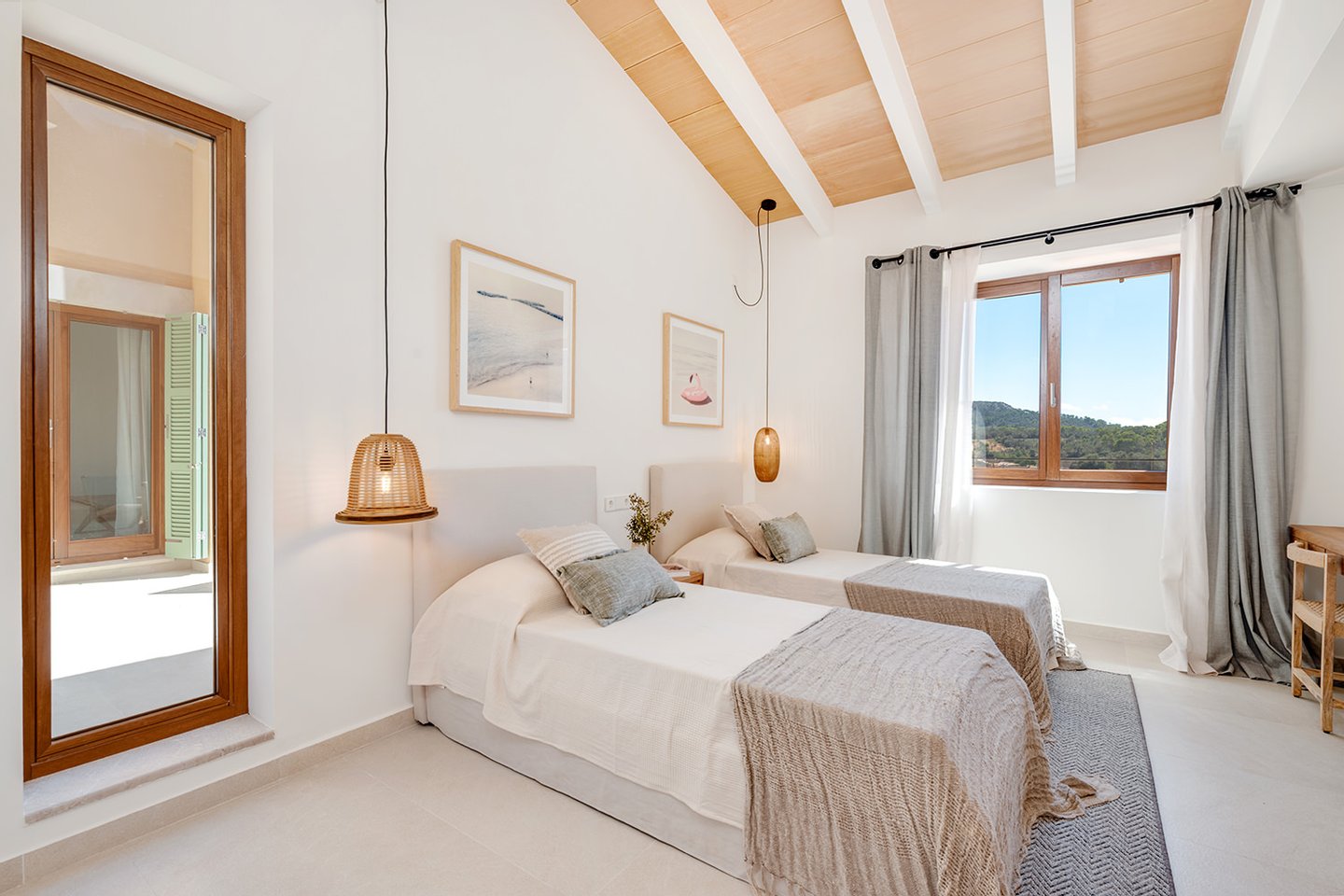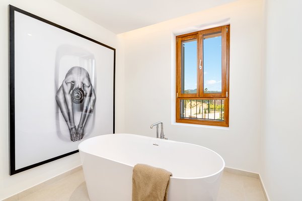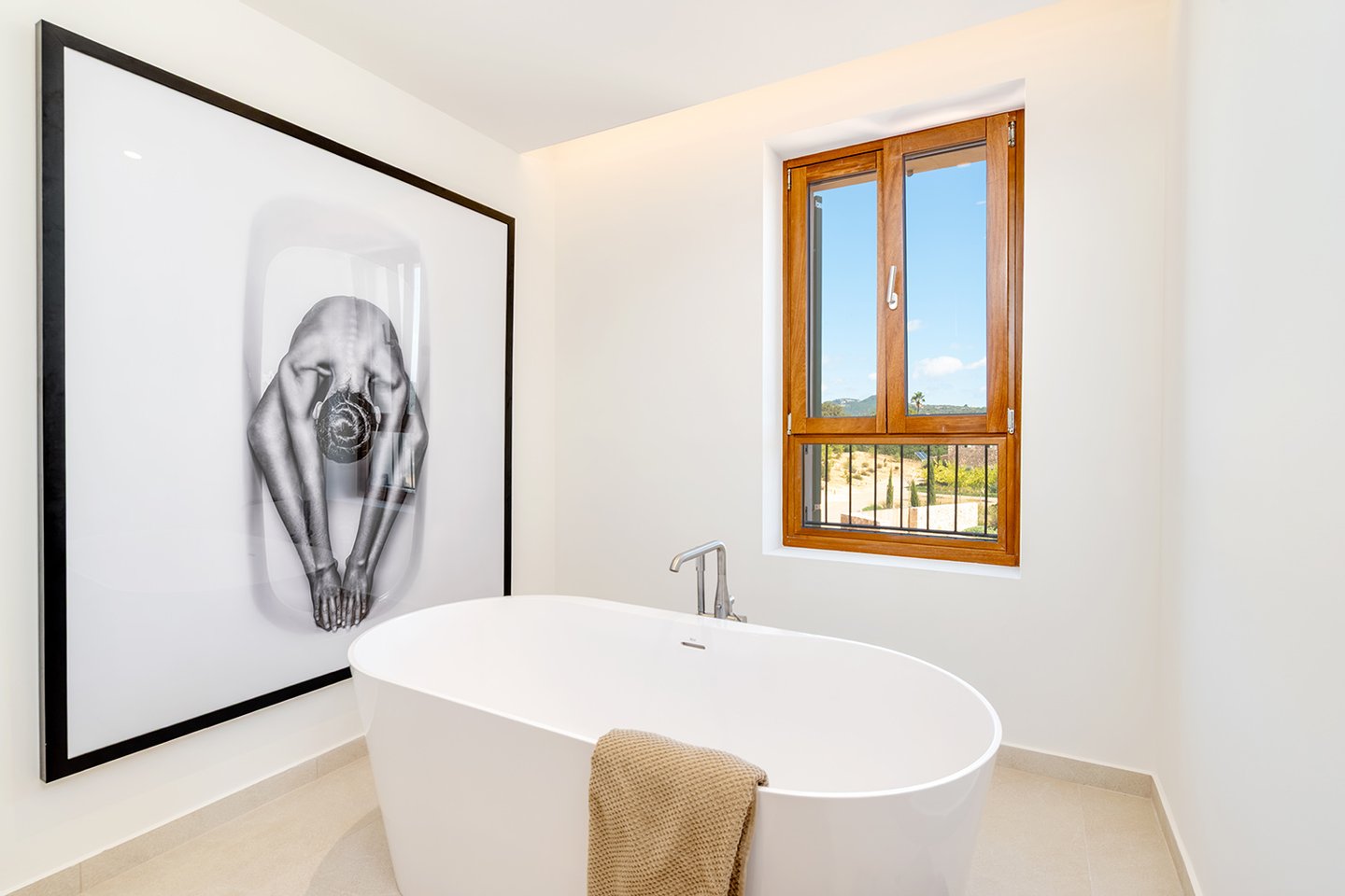 Über eine Treppe gelangen Sie ins Obergeschoss, wo eine großzügige Master-Suite mit Ankleide, Bad mit freistehender Badewanne und Zugang zu einer Terrasse mit Panoramablick auf die umliegenden Berge wartet. Zwei weitere Schlafzimmer und zwei Badezimmer, eines davon en Suite, bieten zusätzlichen Raum und Komfort.