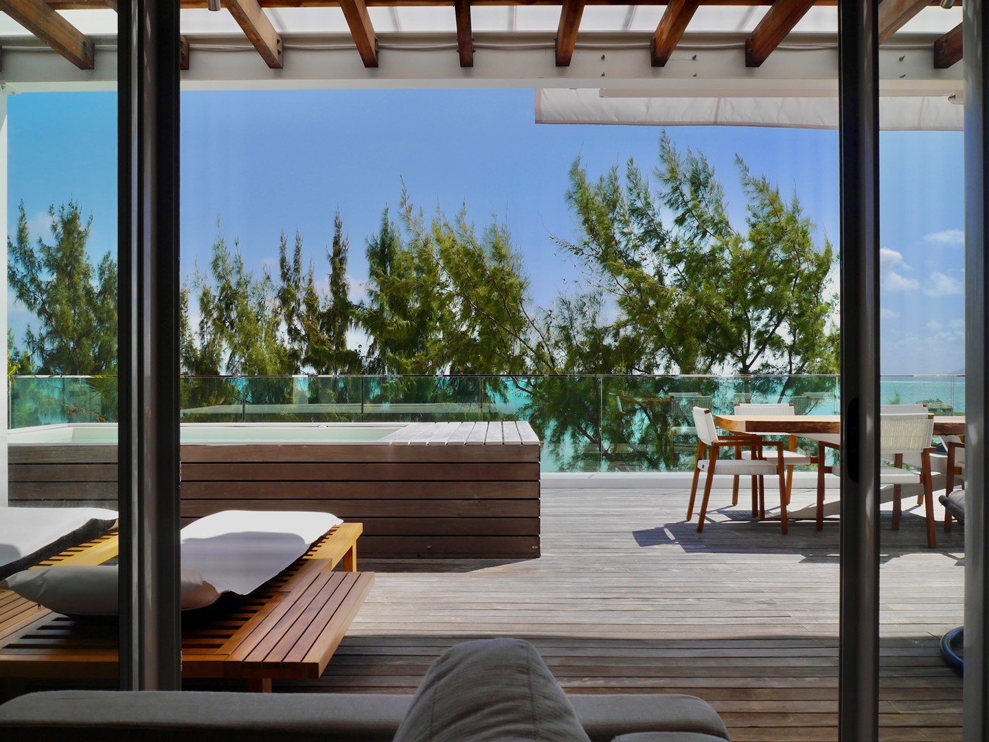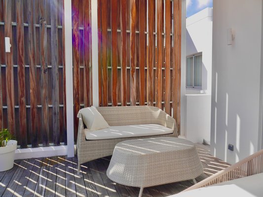 Großer Balkon mit Essbereich und Whirlpool