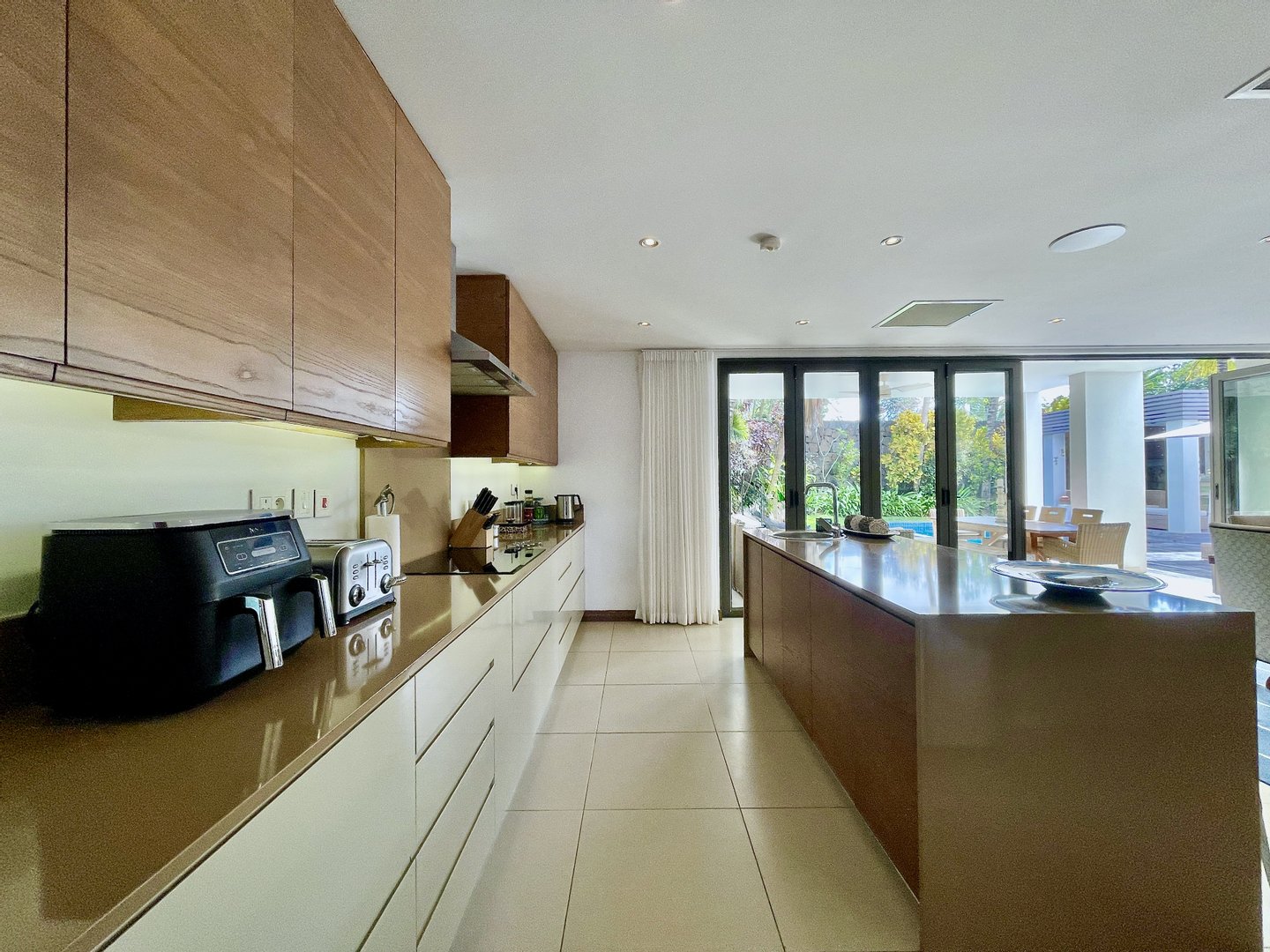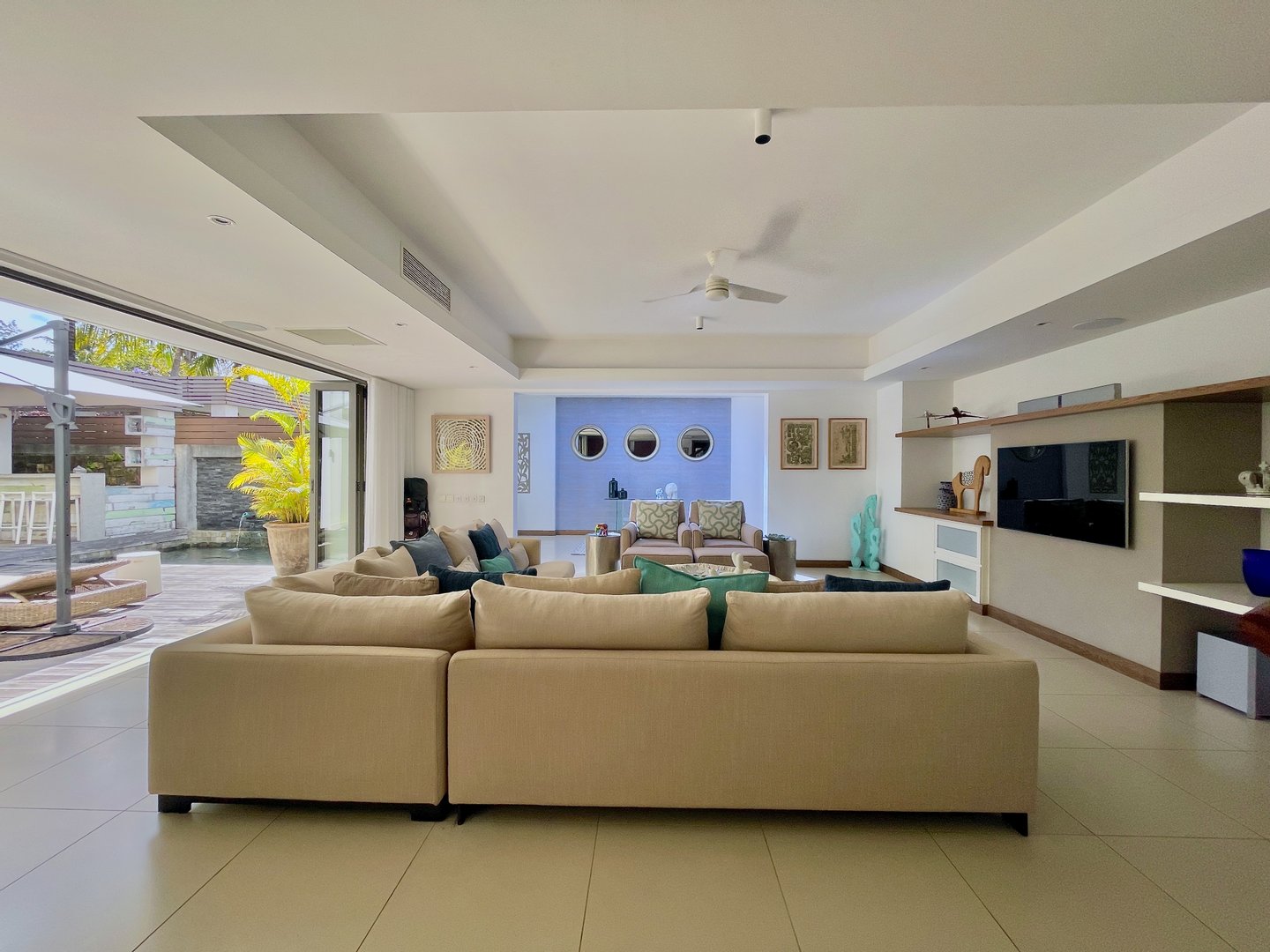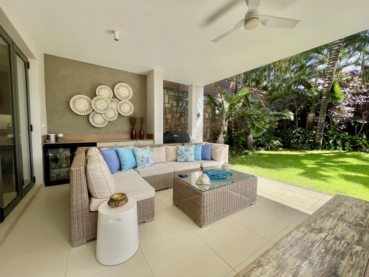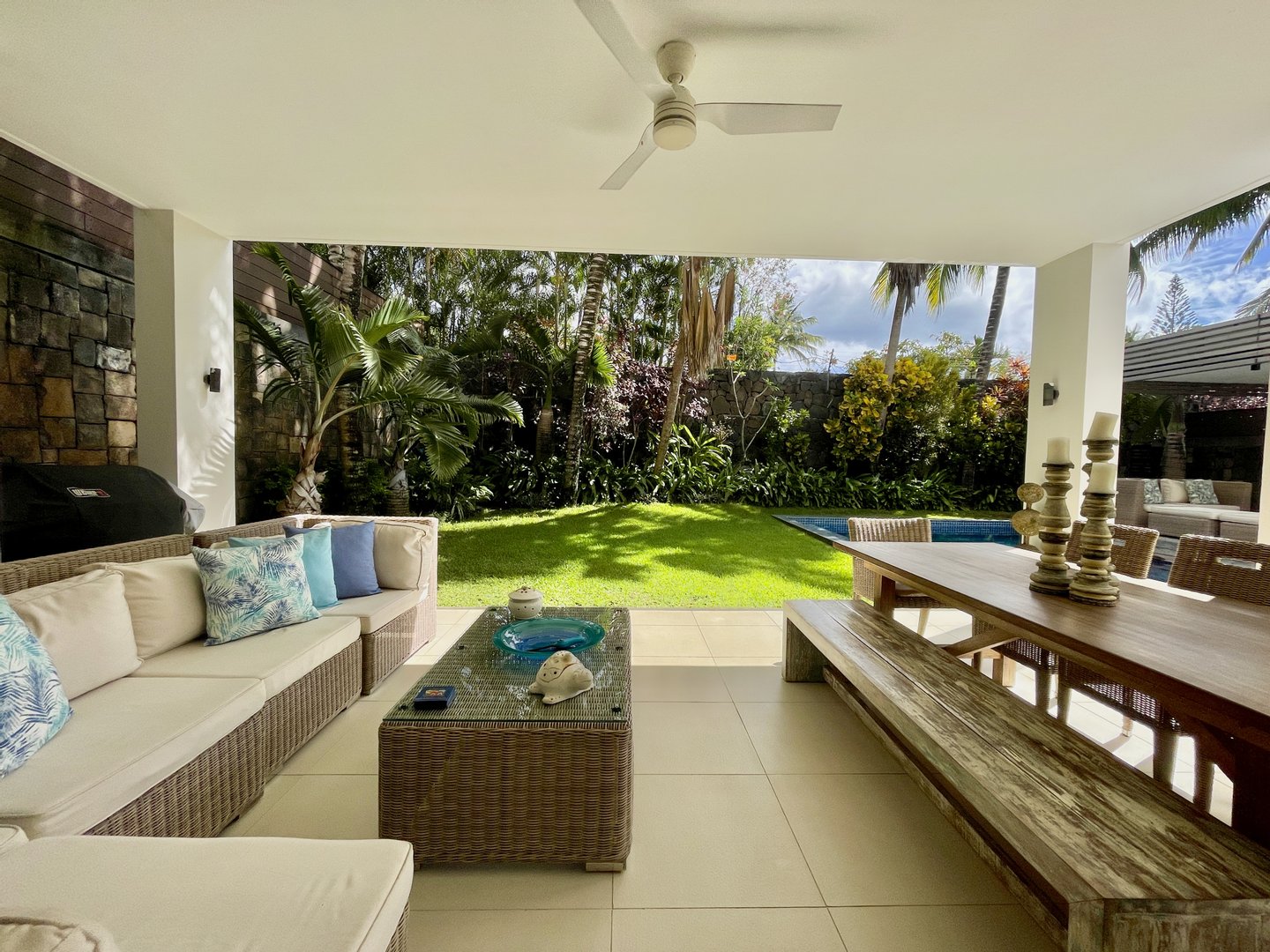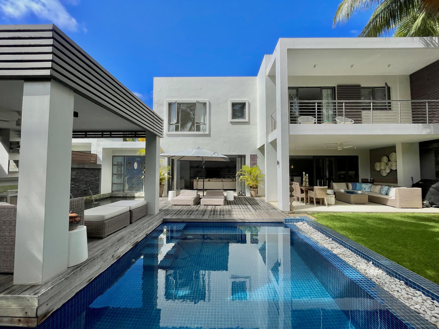 Der Wohnbereich erstreckt sich mühelos zu einem gepflegten privaten Garten mit einem funkelnden Pool, einem ruhigen Wasserspiel und einer einladenden Unterhaltungsbar, die die ideale Umgebung bietet, um Gäste zu empfangen oder stilvoll zu entspannen.