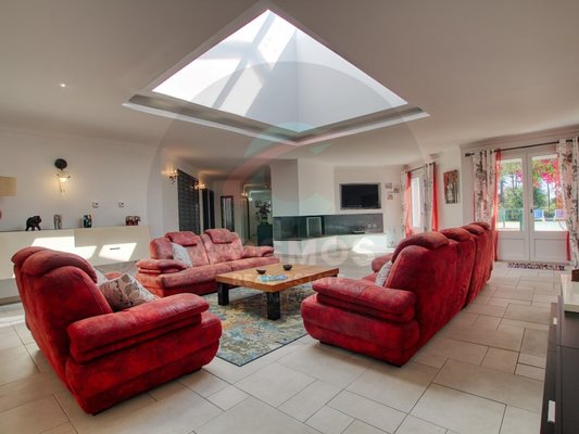 - Wohnzimmer: 60 m² mit Oberlicht und Kamin