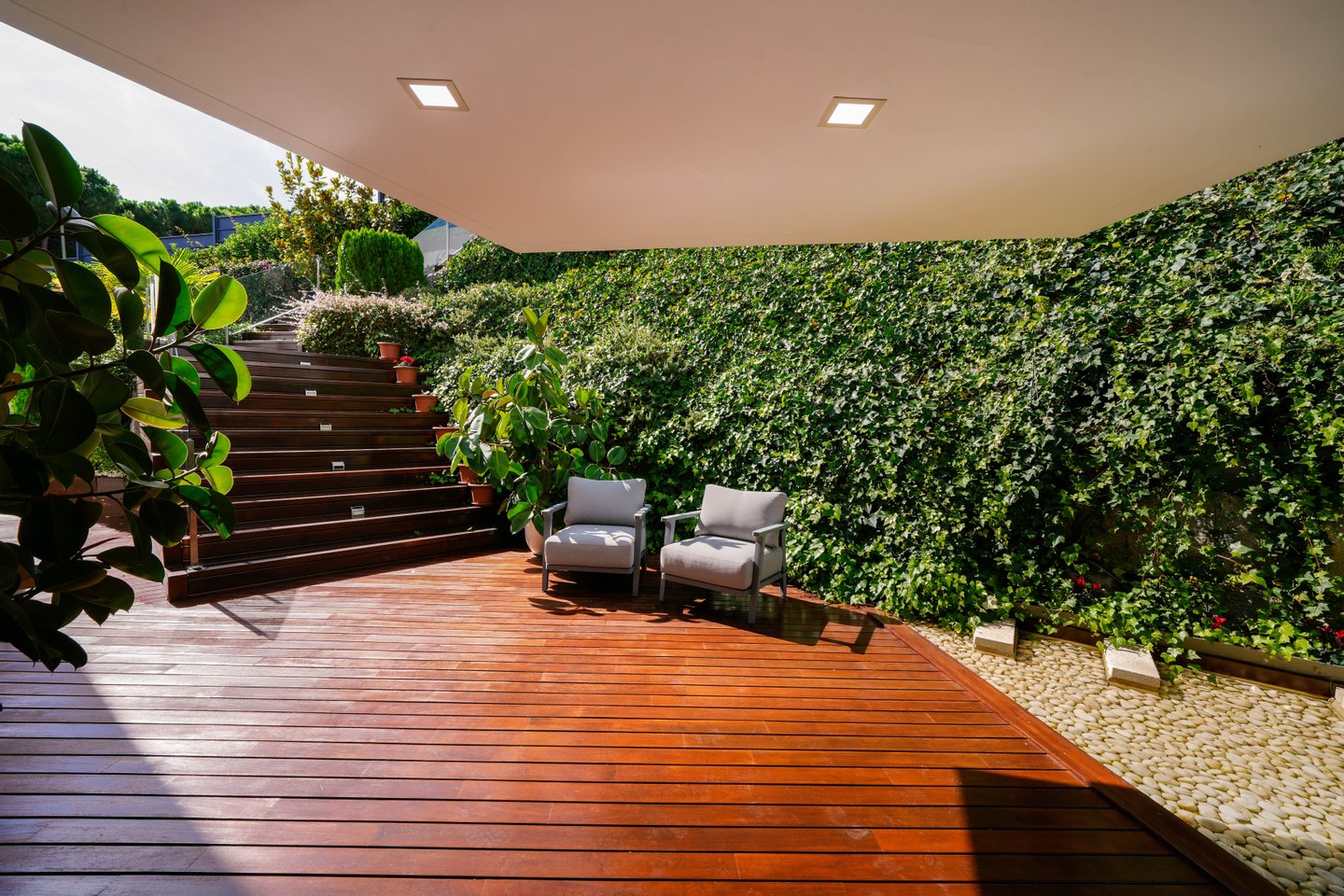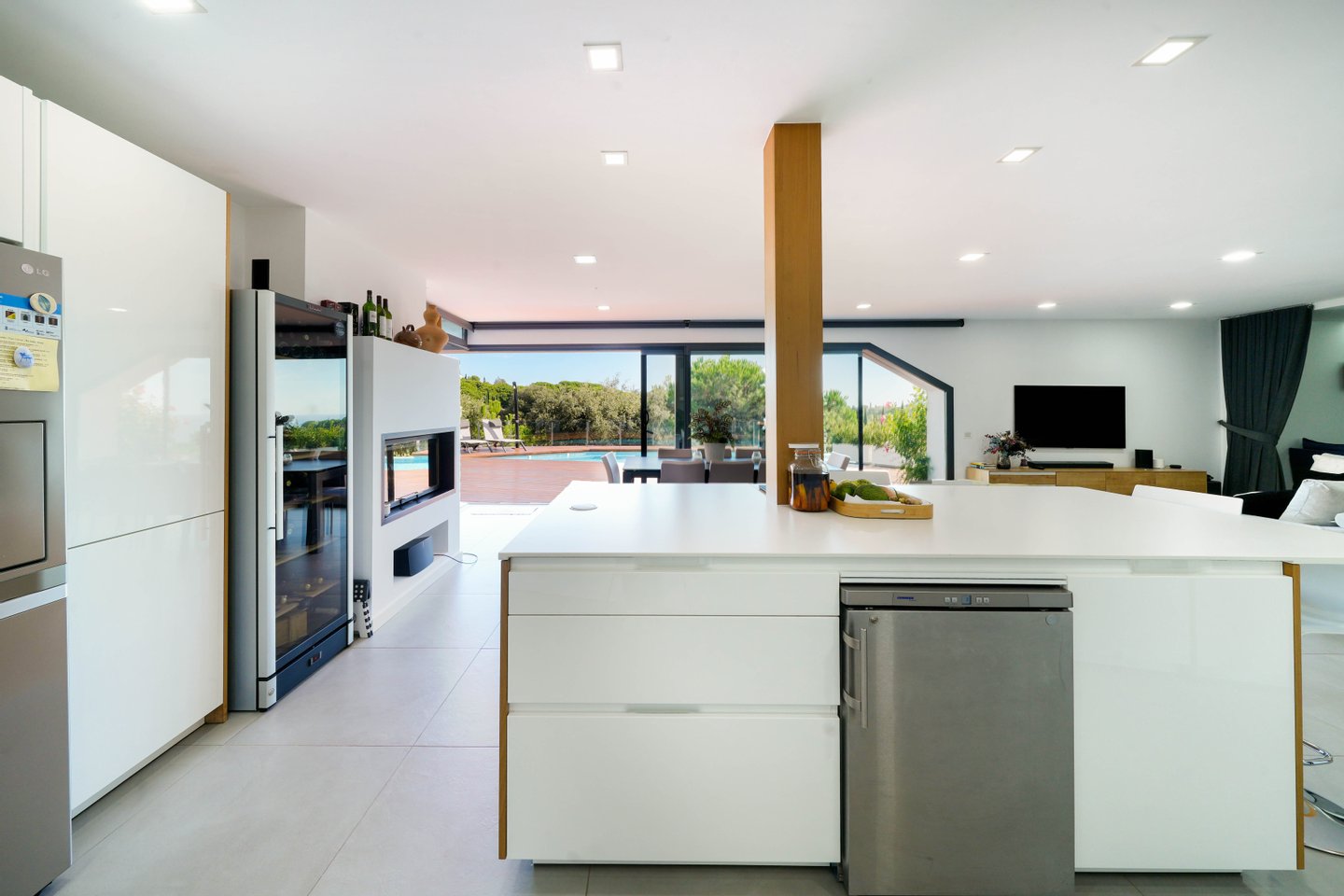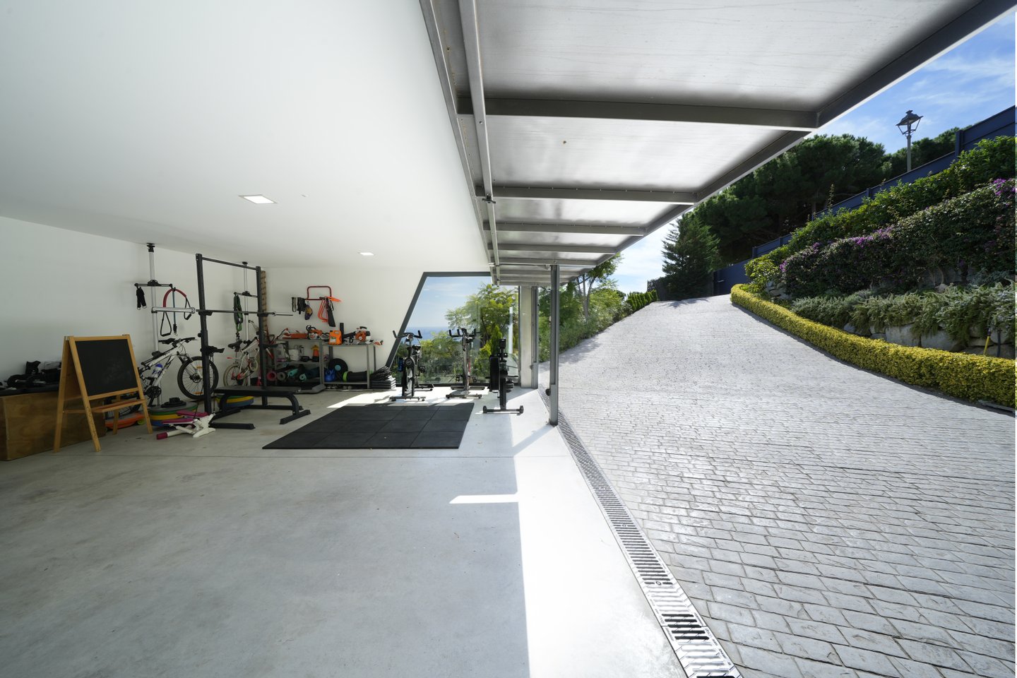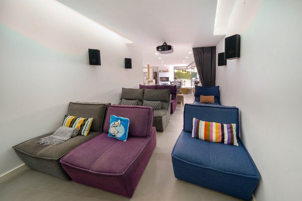 Garten, der das ganze Haus umgibt, Infinity-Pool, Chill-out-Bereich, Grill und Pergola. Innen, zweites Wohnzimmer mit Küche, Kinoraum, Badezimmer, schalldichter Raum, Maschinenraum und Waschküche.