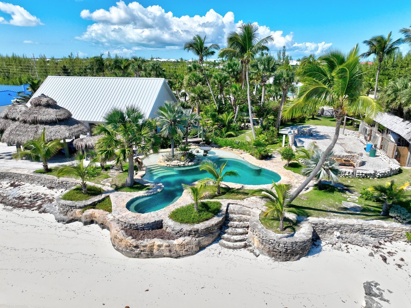 Erleben Sie Barfuß-Luxus am Windward Beach in Treausre Cay, Abaco. Dieses außergewöhnliche 4200 m² große Anwesen am Strand erstreckt sich über zwei Grundstücke mit Ocenafront, die vollständig mit Mauern und zwei bewachten Eingängen für Privatsphäre umgeben sind. Das Haus wurde für ein entspannendes, müheloses Inselleben konzipiert und bietet weitläufige Terrassen mit verträumten Tiki-Pavillons zum Entspannen und Essen im Freien mit Blick auf das türkisfarbene Meer von Abaco. Die üppige tropische Landschaft, ein Meisterwerk des weltbekannten Landschaftsdesigners Raymond Jungles, zeichnet sich durch einen mäandernden Fisch- und Schildkrötenfluss, lebendige einheimische Pflanzen und hoch aufragende Palmen sowie einen Infinity-Pool aus Naturstein am Strandrand aus, der sich nahtlos in die Spitze des Meeres einfügt. Dieses seltene Anwesen kombiniert zeitlose karibische Architektur, Outdoor-Leben im Resort-Stil und exquisite natürliche Schönheit, um ein einzigartiges Refugium in einer der begehrten Gated Communities von Abaco zu schaffen.