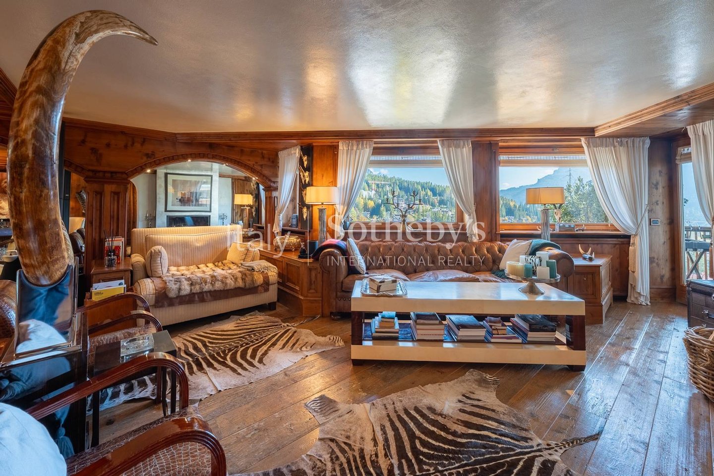 An alpine retreat where luxury meets tradition: fine wood paneling, art pieces, and exotic details blend seamlessly into warm, sophisticated, and enveloping spaces. The spacious living room, wrapped in soft fabrics and warm tones, is enhanced by a