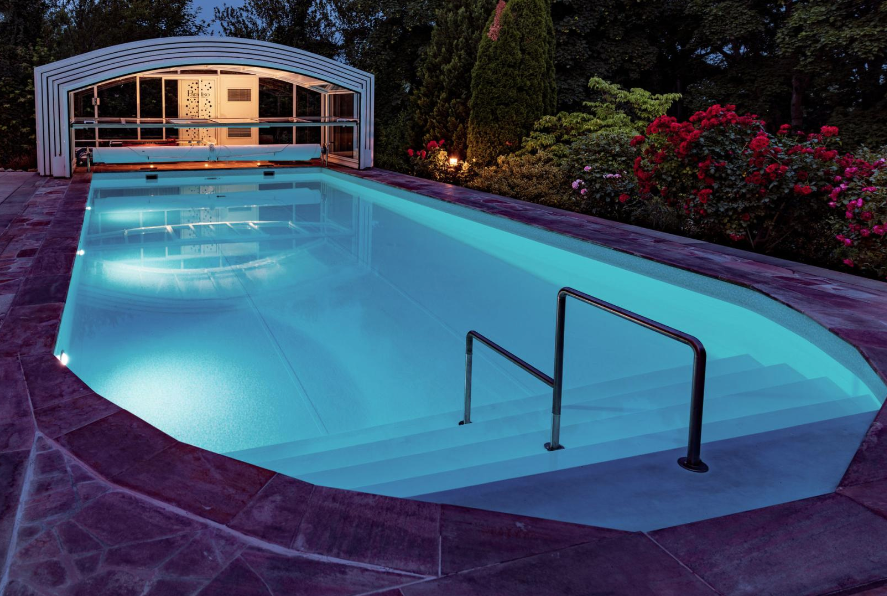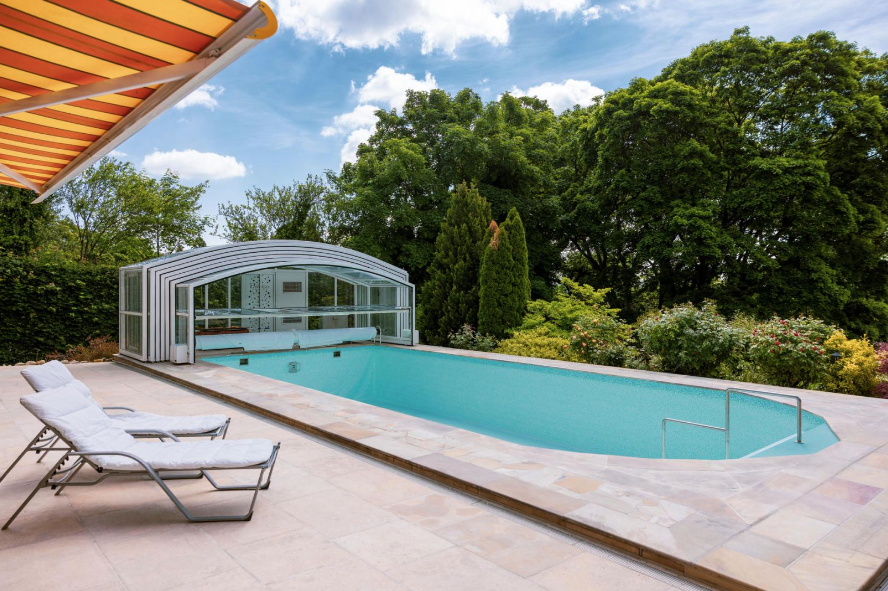 Beheizter Außenpool (12 × 5 m) mit Natursteinterrasse und motorisierter, begehbarer Glaskuppel (neu)