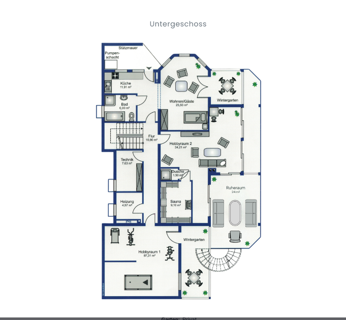 Hanggeschoss: Aufgrund der Hanglage ein vollwertiges Wohngeschoss mit Gästewohnung, Wellnessbereich, Technikräumen und zwei Wintergärten mit Zugang zur ca. 100 m² großen Terrasse