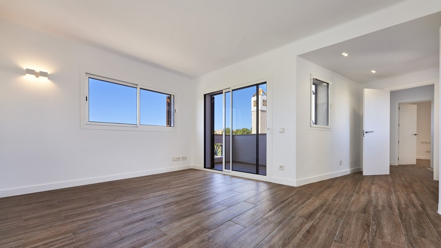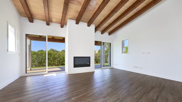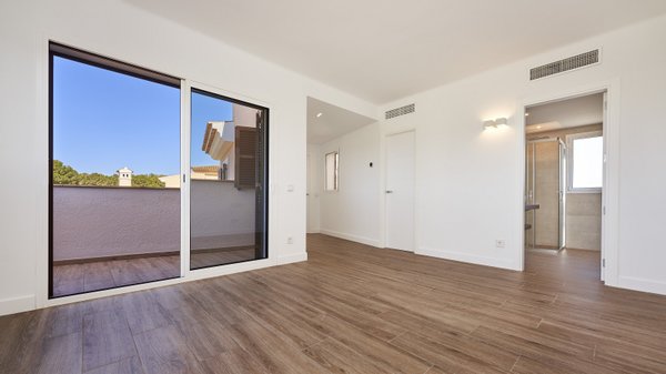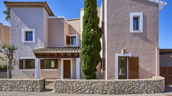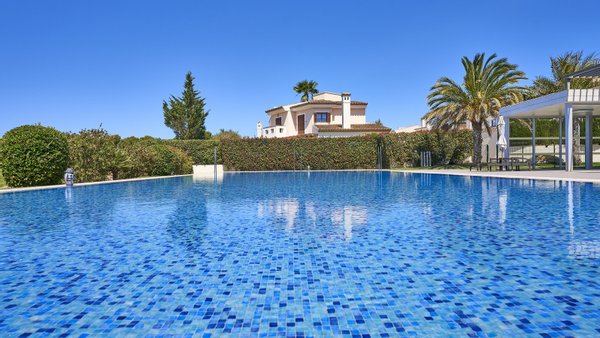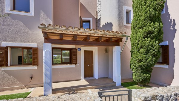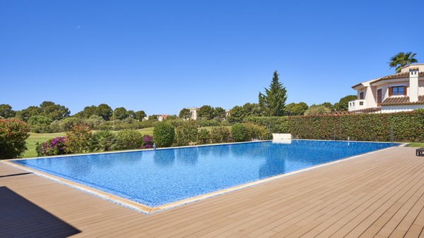 Immobilien Makler Mallorca: Diese traumhafte Villa Mallorca befindet sich in einer exklusiven Anlage mit Pool in erster Linie zum Golfplatz von Santa Ponsa, im Südwesten von Mallorca.Die lichtdurchflutete Villa befindet sich auf einem pflegeleicht angelegten Garten-Grundstück von ca. 198 m2. Sie bietet eine Wohnfläche von ca. 216 m2 verteilt auf zwei Etagen. Die Immobilie verfügt über 3 sehr geräumige Schlafzimmer mit Einbauschränken und Bädern en Suite, einen grosszügigen, Wohn-/ Essbereich mit Zugang zum Garten durch grosse Schiebetüren, eine moderne, offene Einbauküche, sowie einen Hauswirtschaftsraum. Das Innendesign zeichnet sich durch edle Materialien und mediterrane Akzente aus.  Fliesenböden in Holzoptik und elegante Holzbalkendecken verleihen dem Raum eine besonders angenehme und einladende Atmosphäre. Zu der Ausstattung der Immobilie gehören: Klimaanlage über Wärmepumpe, doppelt verglaste Aluminiumfenster, Sonnenblenden, Kamin, Einbauschränke, SAT-TV, Telefonanschluss, sowie ein Abstellraum.  Die exklusive Anlage bietet einen Gemeinschaftspool umgeben von Liegeflächen mit wunderschönem Blick auf den Golfplatz und die gemeinschaftlichen Grünflächen. Zur Villa gehören zwei Parkplätze mit elektrischem Tor zur Golfresidenz. Denn was kann es für Anfänger und Fortgeschrittene Schöneres geben, als auf dem Grün in herrlicher Landschaft zu spielen und zu trainieren?und zu wohnen?
