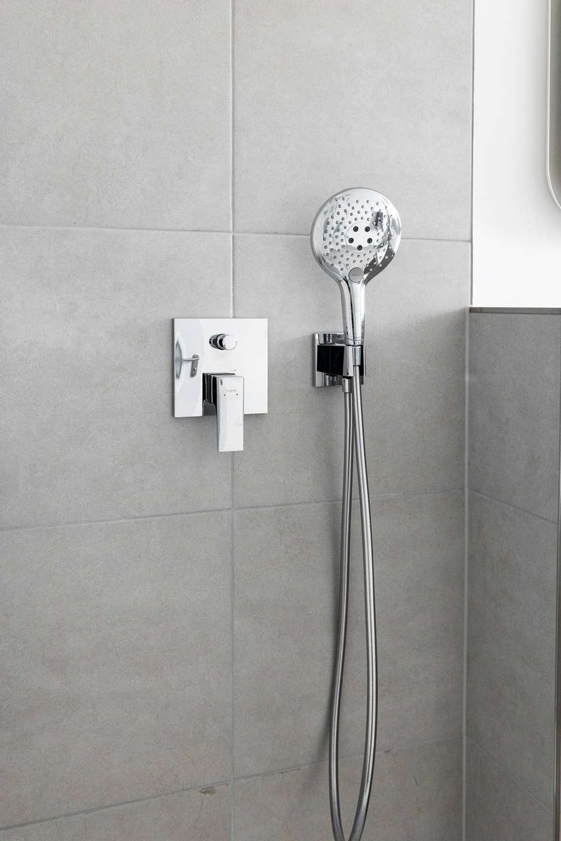 +Hochwertige Fliesen (Villeroy & Boch, 45 × 45 cm, matt weiß) im Bad