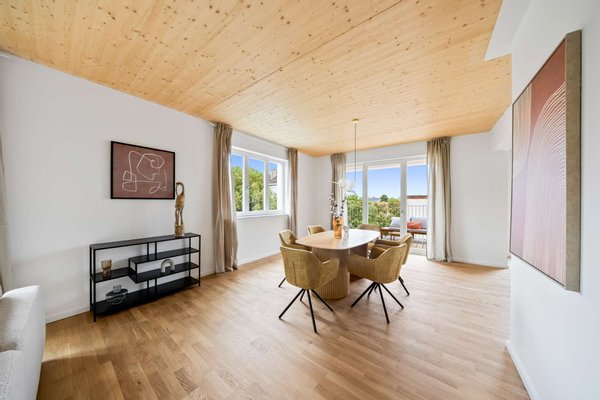 Zur hochwertigen Ausstattung zählen geöltes Eichenparkett, Fußbodenheizung mit Einzelraumregelung, moderne Fliesen (Villeroy & Boch), Sanitärobjekte von Villeroy & Boch und Hansgrohe, sowie dreifach verglaste Holzfenster mit erhöhter Schalldämmung. Die Terrasse ist mit robustem keramischem Plattenbelag ausgestattet. Die Beheizung erfolgt über Fernwärme; der Endenergiebedarf beträgt 56,4 kWh/(m²*a), Energieeffizienzklasse B.
