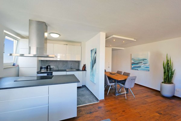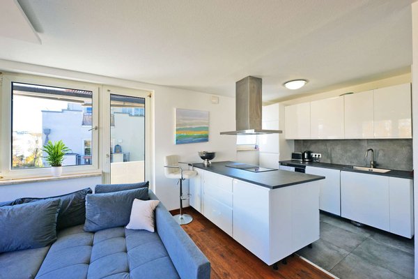 Der offene Wohn- und Essbereich bildet das Herzstück der Wohnung. Großzügige Fensterflächen lassen den Raum in warmem Tageslicht erstrahlen und schaffen eine Atmosphäre, in der man sofort ankommt. Die offene Küche mit moderner Kochinsel und integriertem Waschmaschinenanschluss fügt sich harmonisch in das Wohnkonzept ein und lädt zum gemeinsamen Kochen und Genießen ein. Vom Wohnbereich aus gelangt man direkt auf den Ostbalkon, der – oft liebevoll als Frühstücksbalkon genutzt – mit den ersten Sonnenstrahlen des Tages verzaubert und den perfekten Start in den Morgen schenkt.