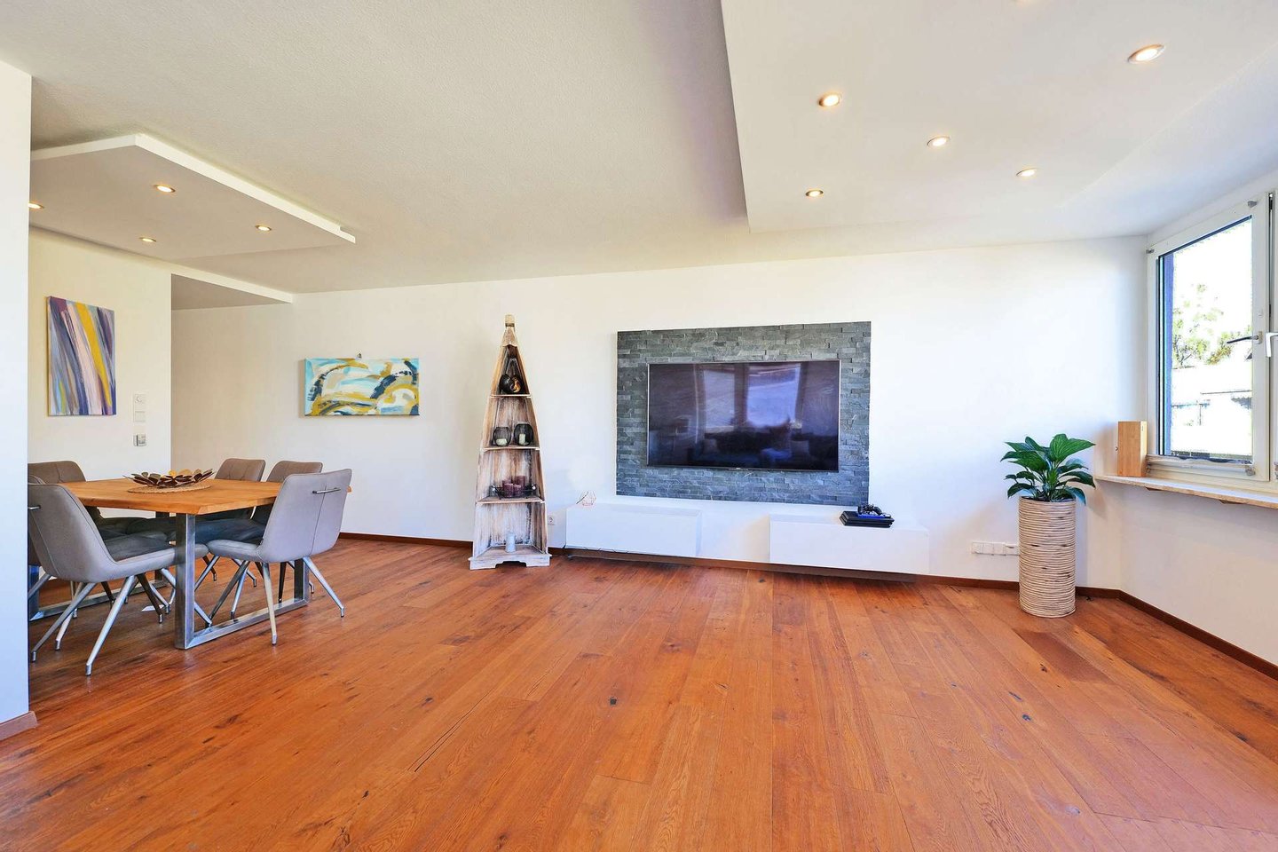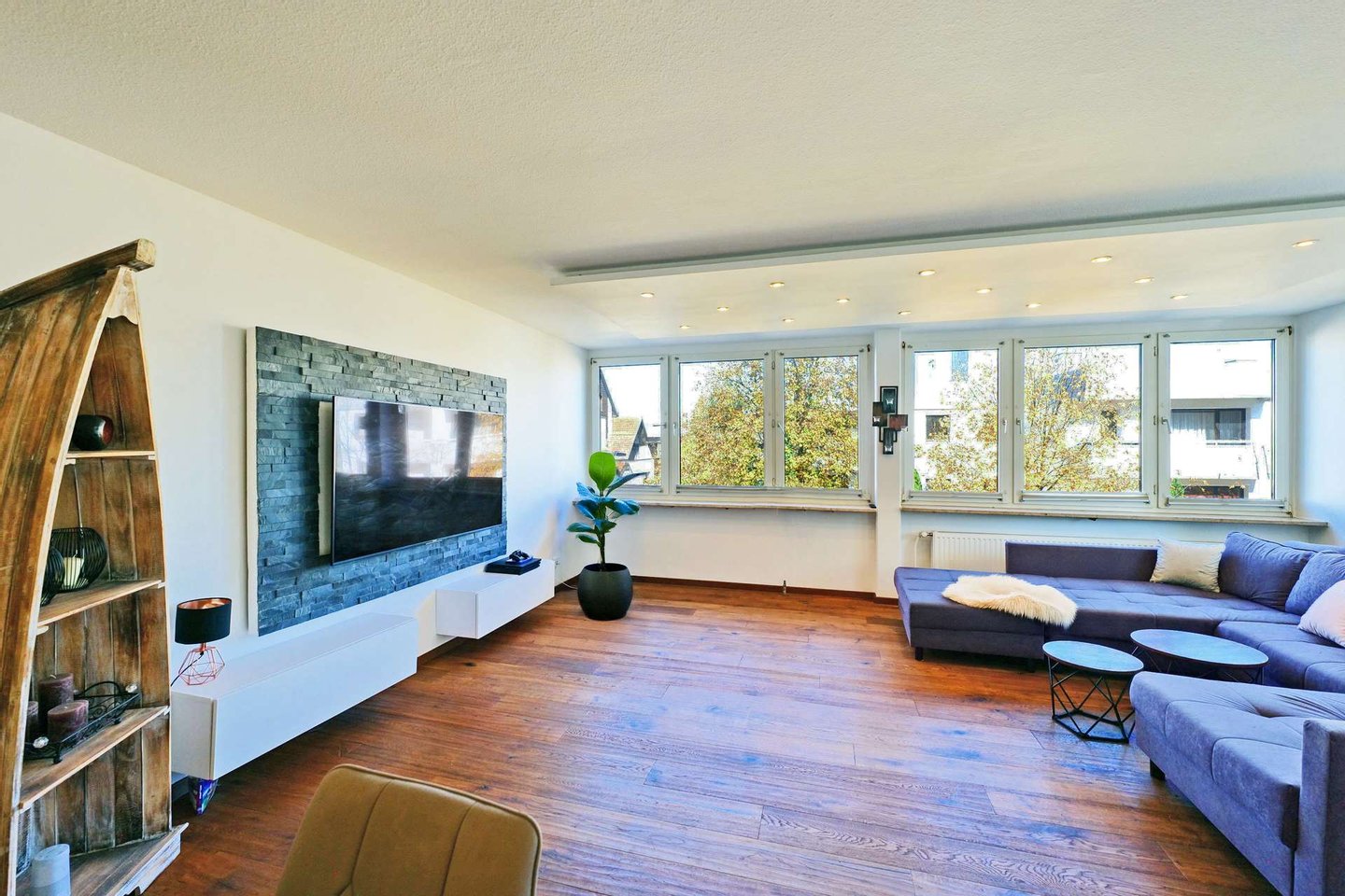 Die drei großzügig geschnittenen Zimmer bieten Raum für individuelles Wohnen – ob als behagliches Schlafzimmer mit Bad en Suite, stilvolles Homeoffice oder liebevoll gestaltetes Kinderzimmer. Der hochwertige Parkettboden unterstreicht das warme Wohngefühl und verleiht jedem Raum eine natürliche Eleganz. Besonders ins Auge fallen die stilvollen Schieferwandapplikationen im Flur und Wohnbereich, die der Wohnung eine moderne, zugleich zeitlos-edle Note verleihen.