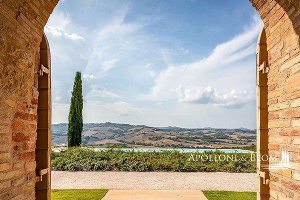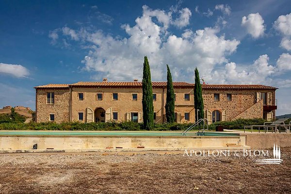 Naturschutzgebiet, 84 Hektar Land, wunderschön restauriertes altes Bauernhaus mit Luxuskomfort, Domotik und Aufzug in Volterra zu verkaufen Eine lange weiße Straße führt zu einem herrlichen, fachmännisch restaurierten Landgut mit 84 Hektar Ackerland in einem Naturschutzgebiet, nur wenige Minuten von Volterra entfernt und in strategischer Lage für einen einfachen Zugang zu San Gimignano, Bolgheri und der tyrrhenischen Küste. Das im Jahr 2018 sorgfältig renovierte Bauernhaus aus dem Jahr 1800 erstreckt sich über zwei Ebenen mit einer Gesamtfläche von 980 Quadratmetern und verfügt über einen internen Aufzug. Eine große Travertin-Terrasse, die von einer Pergola beschattet wird, blickt auf den Infinity-Pool mit Salzsystem und beheiztem Wasser, der ein bezauberndes Panorama von Olivenhainen und sanften Hügeln überblickt. Die Innenräume vereinen den rustikalen toskanischen Stil mit edlen Oberflächen und modernsten technischen Systemen. Das Erdgeschoss öffnet sich zu einem Eingangsfoyer, das die Treppe und den Aufzug verbindet. Auf der einen Seite befindet sich das Hauptwohnzimmer, das mit dekorativen Holzvertäfelungen, einem bedeutenden Kamin und Balkendecken verziert ist. Die angrenzenden Räume folgen harmonisch aufeinander, wobei sich Terrakotta-Gewölbe mit großen Steinplattenböden abwechseln. Ein zusätzliches Wohnzimmer mit einem antiken Holzofen, ein Musik-/Kinosaal und ein Atelier bieten raffinierte Räume für Entspannung und Kreativität. Das Herzstück des Hauses ist die Küche mit zentraler Kochinsel, die offen mit dem Essbereich verbunden ist und direkten Zugang zur Pergola im Freien bietet, wo eine zweite Küche an Sommertagen zum geselligen Essen im Freien einlädt. Auf der gleichen Ebene befinden sich ein Hauptschlafzimmer mit Kleiderschrank und Bad, ein zweites Schlafzimmer mit Doppelbett und eigenem Bad, sowie eine Speisekammer, eine Waschküche und ein Technikraum. Der erste Stock gliedert sich um einen Wohnbereich, auf der einen Seite befinden sich zwei Schlafzimmer mit eigenem Bad, während der andere Flügel der Villa etwa 200 Quadratmeter umfasst, die sich auf sieben teilweise restaurierte Räume verteilen, die nach eigenem Geschmack und Stil eingerichtet werden können. Ein drittes Hauptschlafzimmer mit unabhängigem Zugang über eine Außentreppe vervollständigt diese Etage.