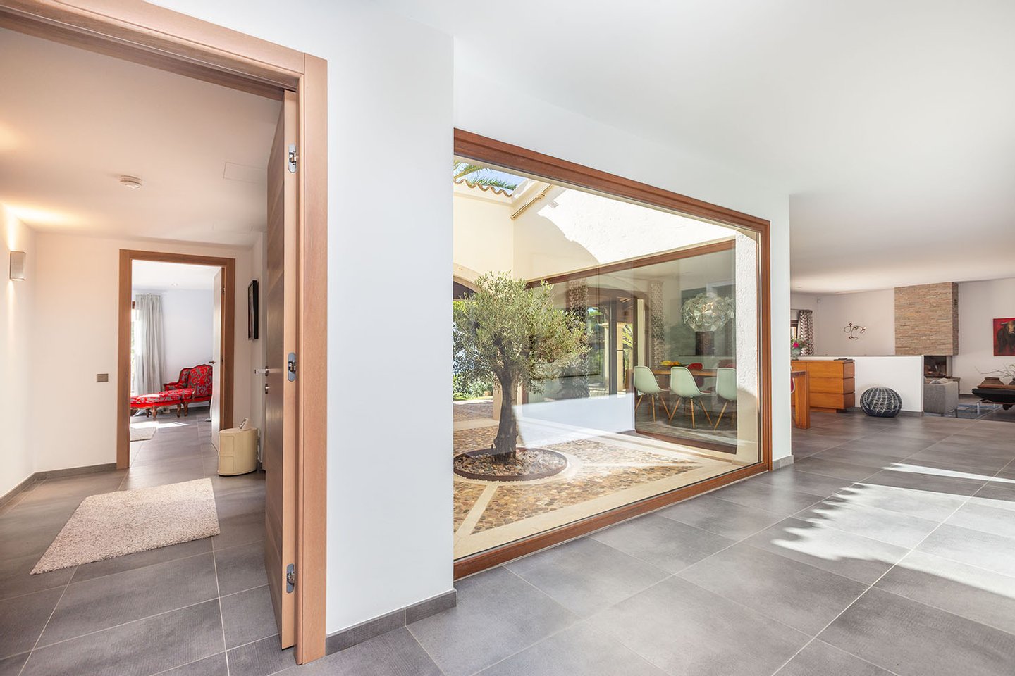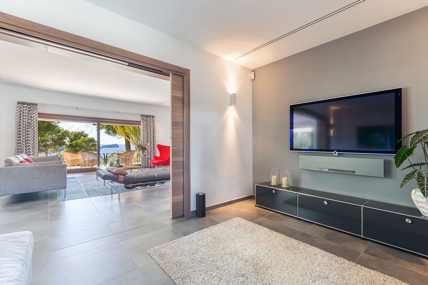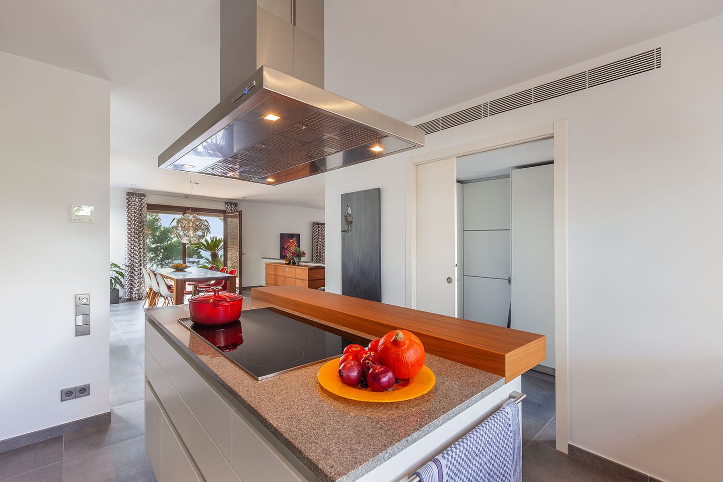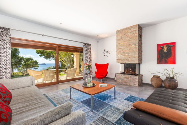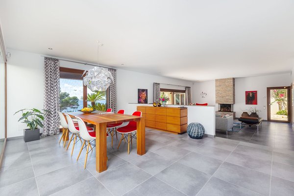 Große Fensterflächen schaffen helle Räume und öffnen den Blick auf die Küste und das Meer, der sich von der Wohnebene und der Poolterrasse aus in einem beeindruckenden 300°-Panorama zeigt. Großzügige, gut geschnittene Räumen mit edlen Steinfliesen, hochwertigen Materialien, einem dreiseitig verglasten Patio sowie einem eindrucksvollen Kamin und sorgfältig ausgesuchten Ausstattungsdetails sorgen für ein einzigartiges Wohnambiente.