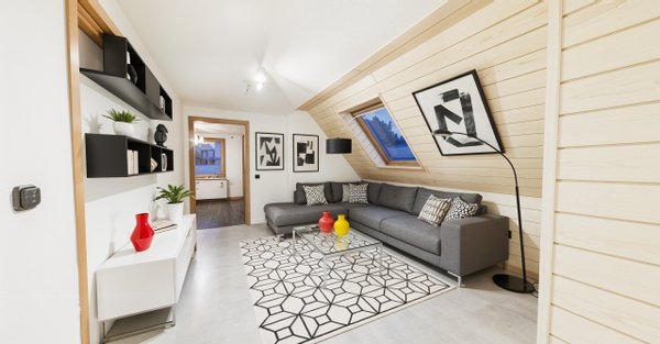 Das Obergeschoss bietet eine weitere abgeschlossene Wohneinheit mit ähnlichem Grundriss – ideal für erwachsene Kinder, Gäste oder als Mietwohnung. Hier finden Sie ebenfalls ein helles Wohnzimmer, zwei Schlafzimmer, eine Küche und ein Bad. Große Fenster sorgen für viel Tageslicht und schaffen eine angenehme Wohnatmosphäre.