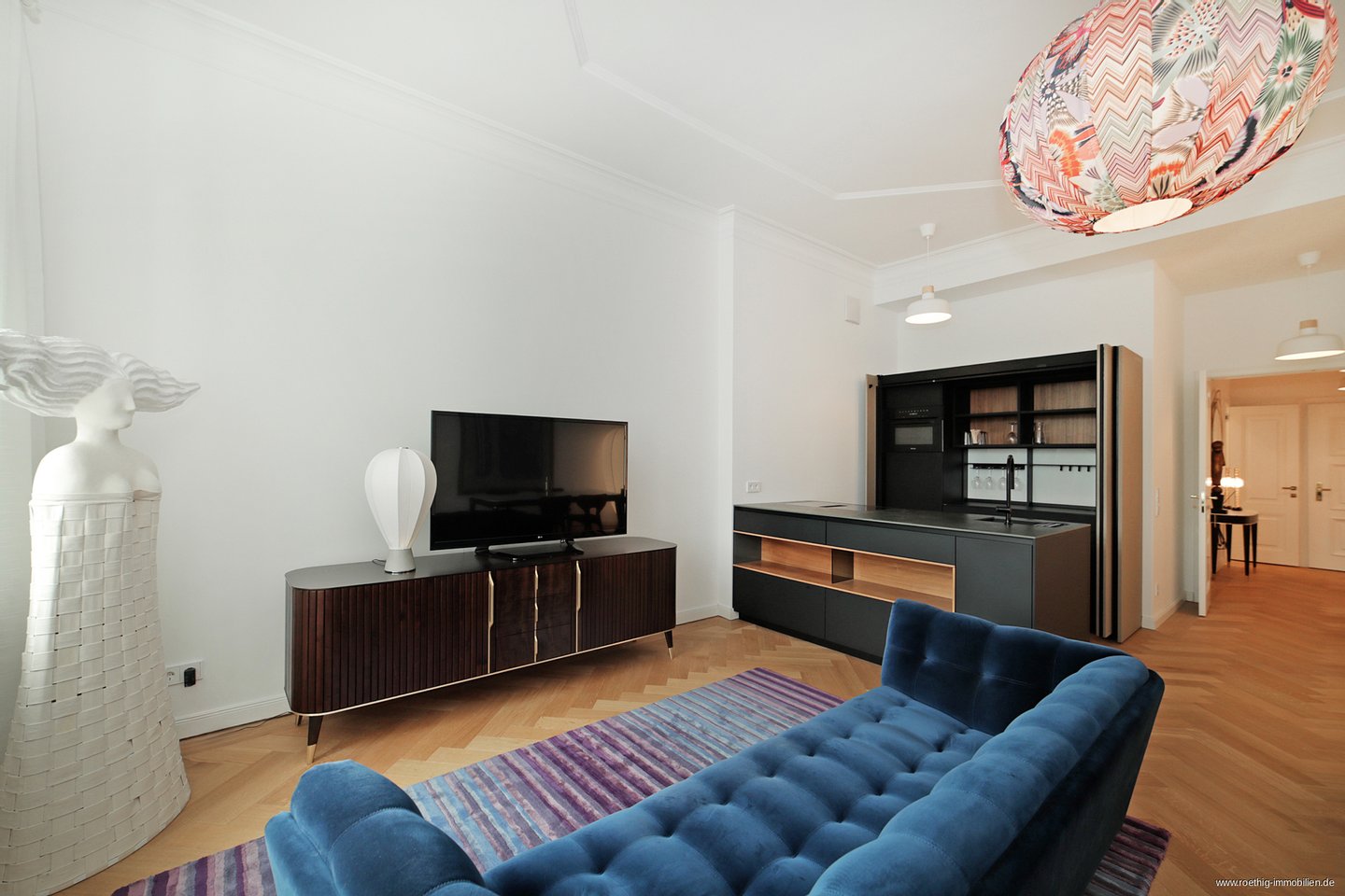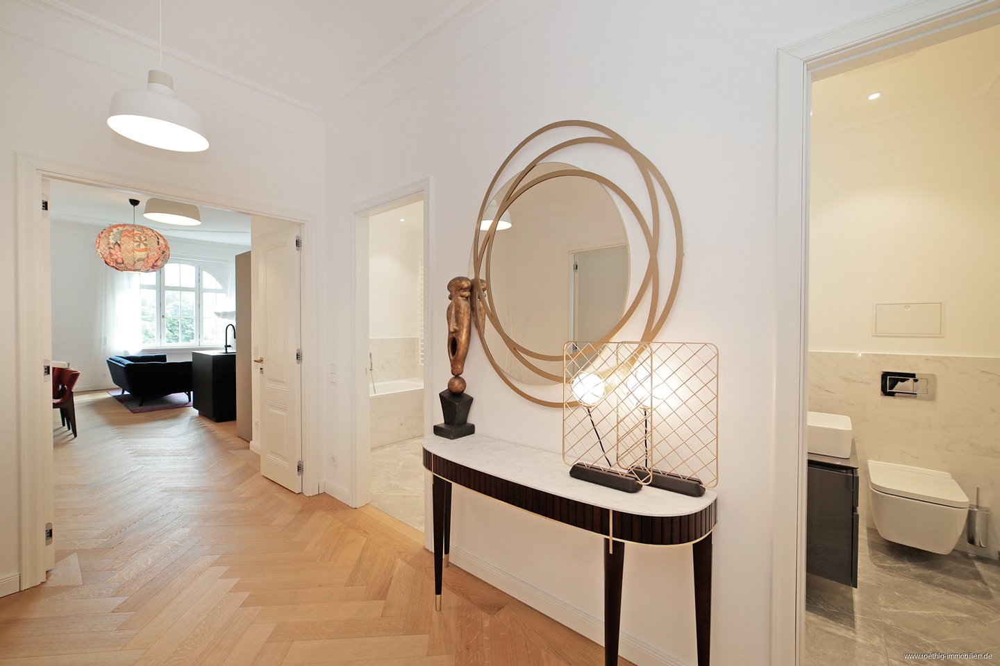 Wir freuen uns, Ihnen diese außergewöhnliche, kernsanierte und stilvoll möblierte 2-Zimmer-Altbauwohnung in einer der begehrtesten Lagen Münchens – direkt am Eisbach und am Englischen Garten – vorstellen zu dürfen. Die elegante Altbauwohnung befindet sich im 4. Obergeschoss mit Aufzug im repräsentanten denkmalgeschützten „Stadtpalais Widenmayer“ aus dem Jahre 1911, welches kürzlich einer Generalsanierung unterzogen wurde und somit in seiner ganzen Schönheit wiederhergestellt wurde.