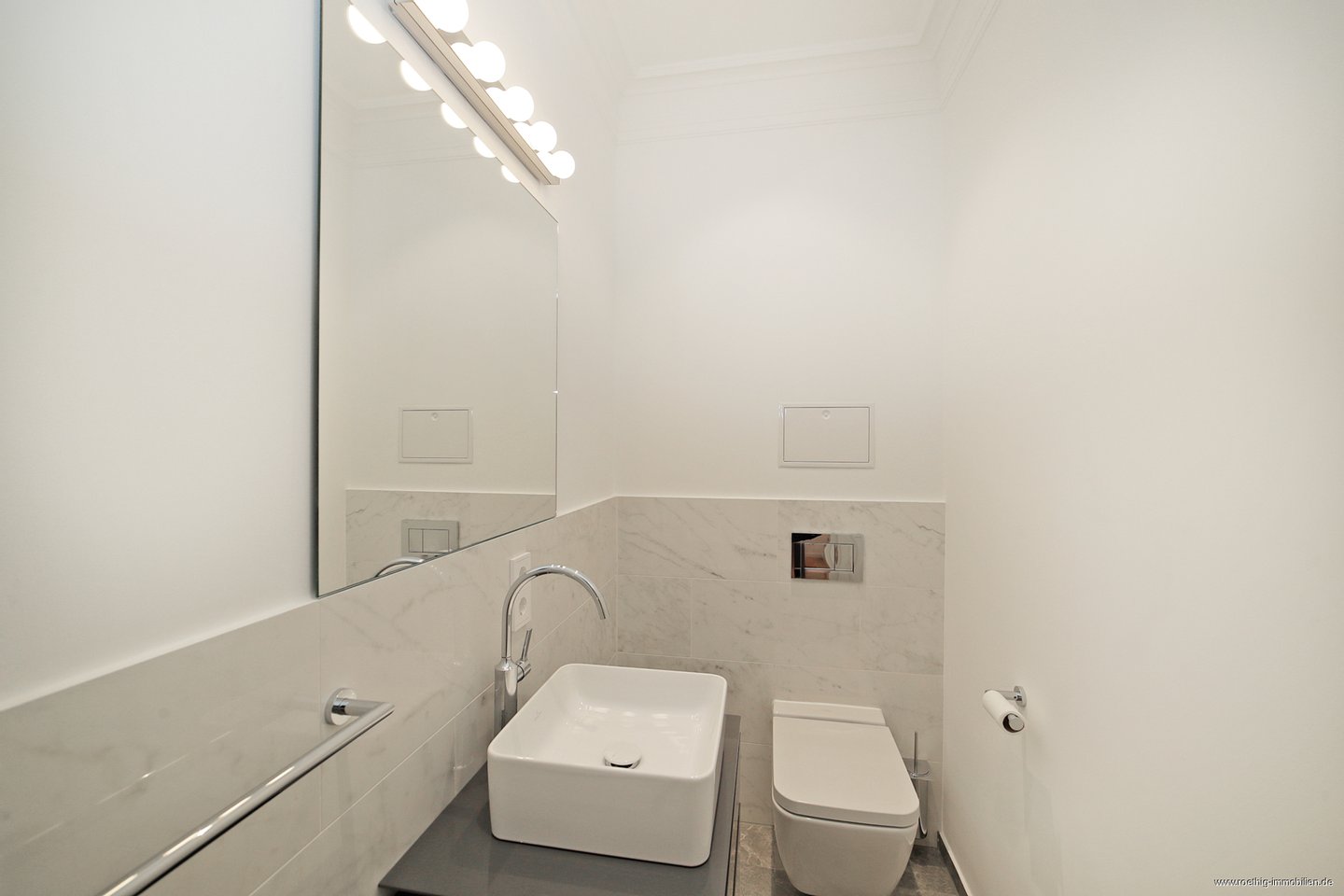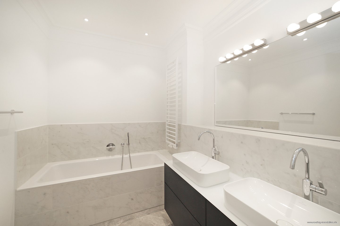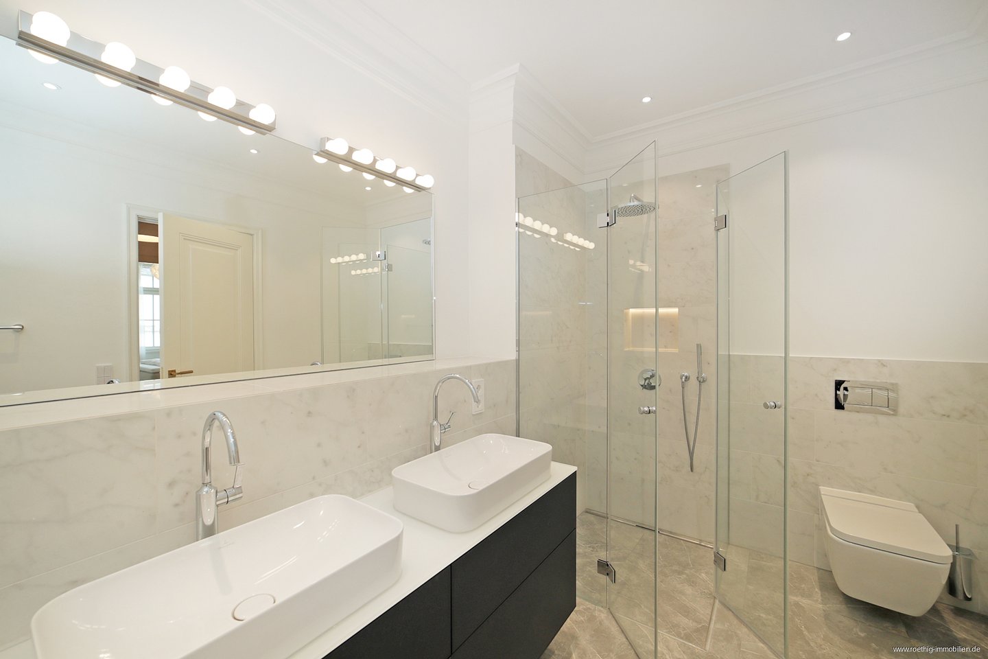 Rechter Hand des Eingangsbereichs liegt das moderne Badezimmer, ausgestattet mit einer bodengleichen Regendusche, einer Badewanne, zwei edlen Waschbecken samt Unterschränken, einem praktischem Handtuchheizkörper und einem WC. Die in Marmoroptik gestaltete Wandverkleidung verleihen eine luxuriöse Atmosphäre - alles in allem ein Badezimmer, was keine Wünsche offenlässt!