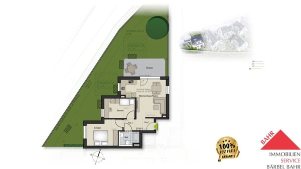 Diese 3-Zimmer-Wohnung (ca. 67 m²) im Erdgeschoss ist ein Juwel für Ruhesuchende. Der spektakuläre Privatgarten mit ca. 98 m² umgibt die Wohnung und schafft eine private, grüne Pufferzone mit maximaler Distanz zu den Wegen.