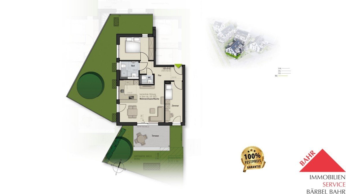 Die Wohnung selbst ist als "barrierefreie Wohnung" (nach LBO § 35) ausgewiesen und bietet einen großzügigen Wohn-Essbereich (ca. 29,5 m²) , zwei gut geschnittene Schlafzimmer, ein Bad und ein separates Gäste-WC.