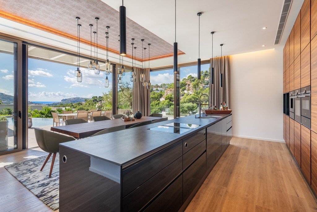Das Haupthaus verfügt über drei geräumige Schlafzimmer und drei Badezimmer, ergänzt durch zwei zusätzliche Gästezimmer und Badezimmer in einem separaten Apartment. Eine raffinierte offene Küche von Nogal, ausgestattet mit Siemens-Geräten, geht nahtlos in den Wohnbereich über. Hochwertige Materialien wie Naturstein und Holzböden unterstreichen die moderne und dennoch warme Ästhetik.