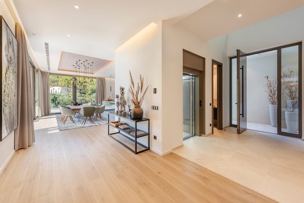Weitere Highlights sind ein 39 m² großer Swimmingpool mit eigenem Badezimmer, ein Aufzug zu allen Etagen, Fußbodenheizung, Klimaanlage und doppelt verglaste Aluminiumfenster. Die Immobilie verfügt außerdem über einen Fitnessraum, zwei Waschküchen, Abstellräume, ein optionales High-End-Möbelpaket und eine einladende Außenküche.