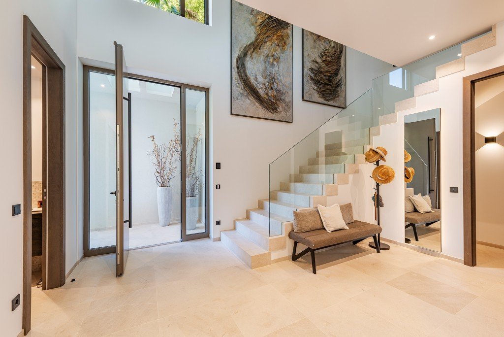 Das Haupthaus verfügt über drei geräumige Schlafzimmer und drei Badezimmer, ergänzt durch zwei zusätzliche Gästezimmer und Badezimmer in einem separaten Apartment. Eine raffinierte offene Küche von Nogal, ausgestattet mit Siemens-Geräten, geht nahtlos in den Wohnbereich über. Hochwertige Materialien wie Naturstein und Holzböden unterstreichen die moderne und dennoch warme Ästhetik.